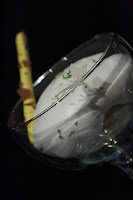 What arrived next was a glass with banana and passion fruit mousse, rum sorbet and coconut mousse on top. A little bit of lime rind shavings added a little extra fragrance, and the candy stick made with passion fruit was interesting, too. VERY nice.