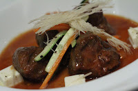 Le porc: la joue confite dans un jus épicé aux légumes croquants - the pork cheek was slow-cooked and reasonably tender, but a few pieces had muscle fibers which were chewy, depending on how they are cut. Not getting why tofu cubes are used here. The thin strands of Arabic rice vermicelli (not sure what it's called) are nice and fine.