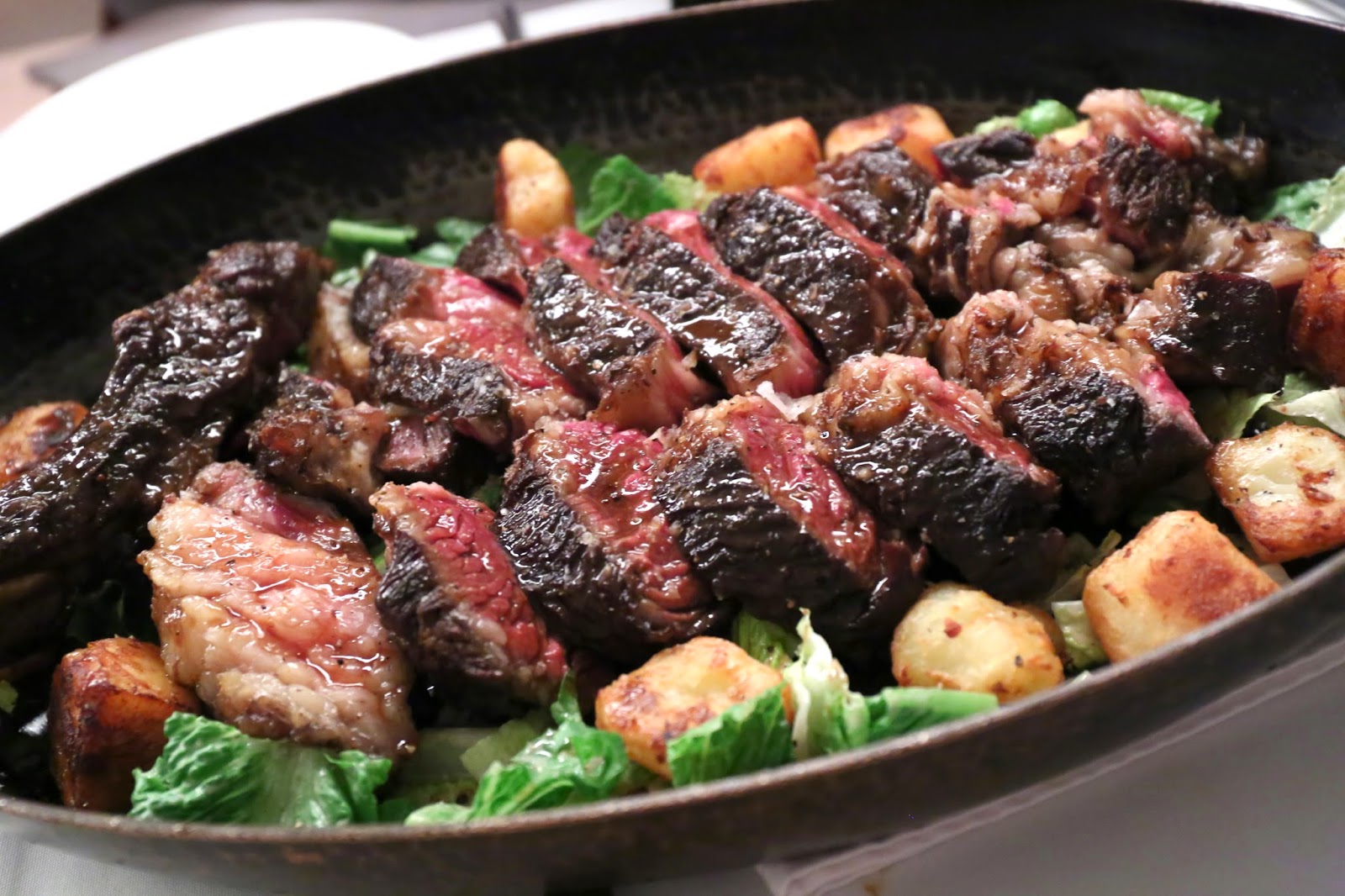 This was amazing. The meat was cooked rare, but it was just sooo full of complexity from the aging. I decided to be good and only have one piece, as I'm trying to get back on the diet wagon. Meanwhile, the taters were simply out of this world, as were the pieces of romaine lettuce with the accompanying sauce. We also had some sautéed spinach on the side.