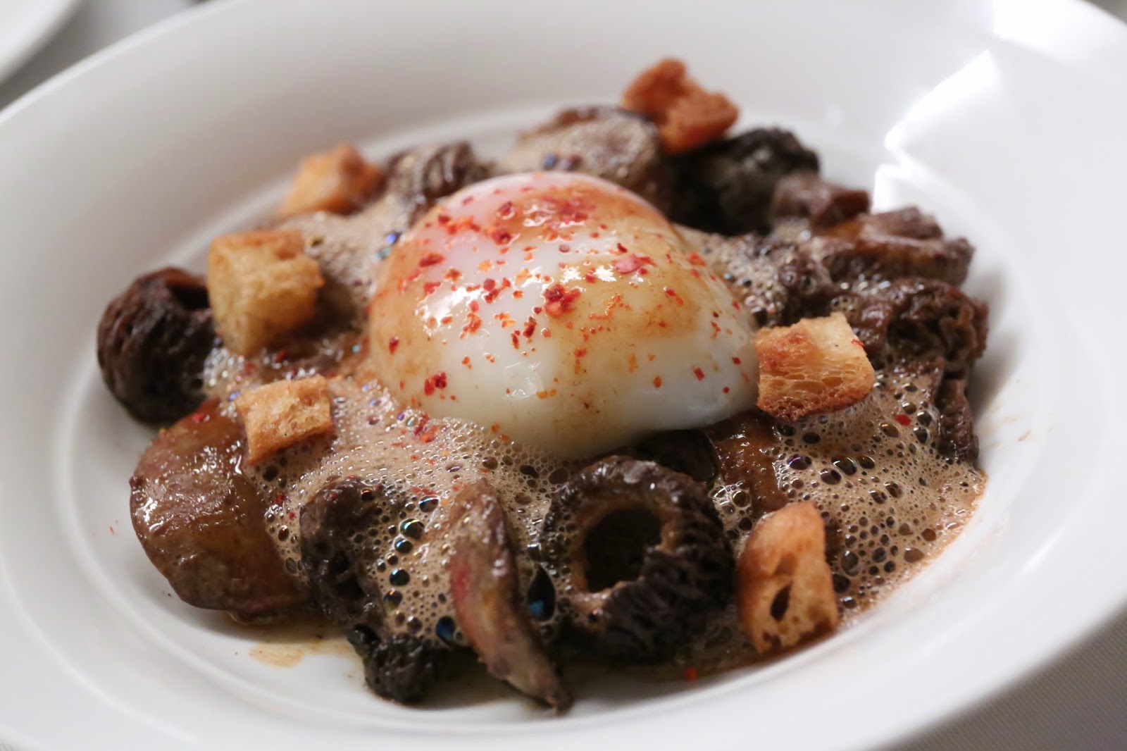 Morel mushrooms with chicken liver - served with soft-boiled organic egg, croûtons and foam. What an absolutely awesome dish! This was quintessentially David, and represents one of the many reasons why we love him. Love that he sprinkled some piment d'espelette on top.