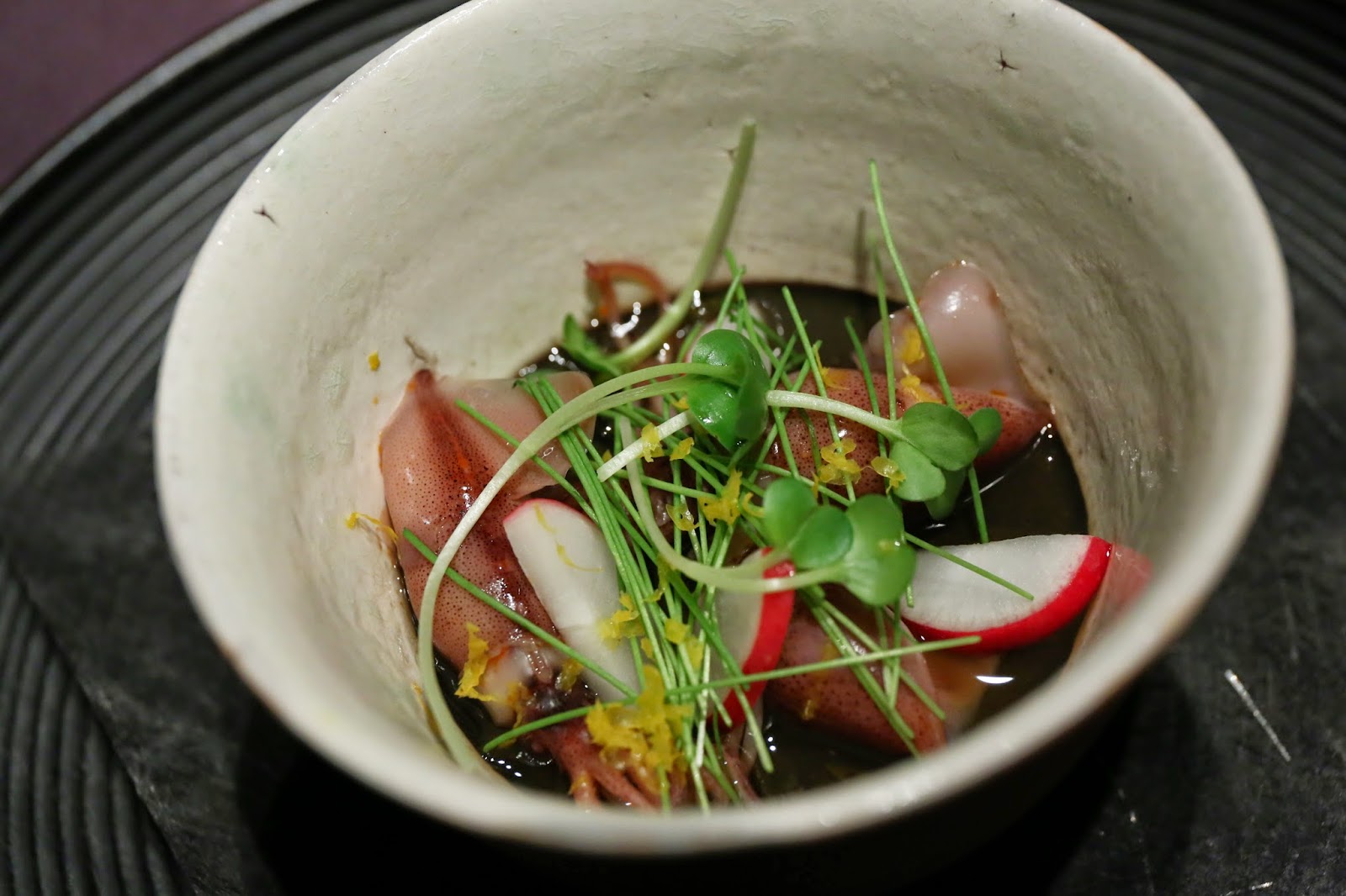 "Black custard" with hotaru baby squid ("ホタルイカ"の茶碗蒸し) - what an awesome dish! Not your average chawanmushi (茶碗蒸し), since this was made with ink from the firefly squid, and with a few of the yummy squid on top along with radish, scallion shoots (芽ねぎ)...etc. They also sprinkled some yuzu (柚子) rind on top so that the fragrance can counteract the strong fishy flavors of the squid, which was a nice touch, but I would have been just as happy to have the full, unadulterated fishy squid taste in my mouth.