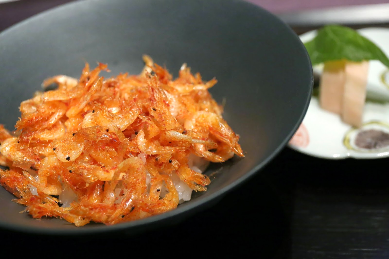 Rice simmered in "sakura tea" with deep fried "sakura shrimp" from Surugawan Bay (龍吟名物 静岡駿河湾 "桜海老"御飯) - truth be told, this was what we came for tonight. Deep-fried sakura shrimp over rice. The shrimps were still really, really, really yummy. The rice still very nicely done. But tonight they sprinkled some plum powder, which turned everything a little more acidic and overpowered the delicate flavors of sakura in the rice... The pickles on the side were pieces of sakura-infused Chinese yam (山芋), along with a sakura leaf.