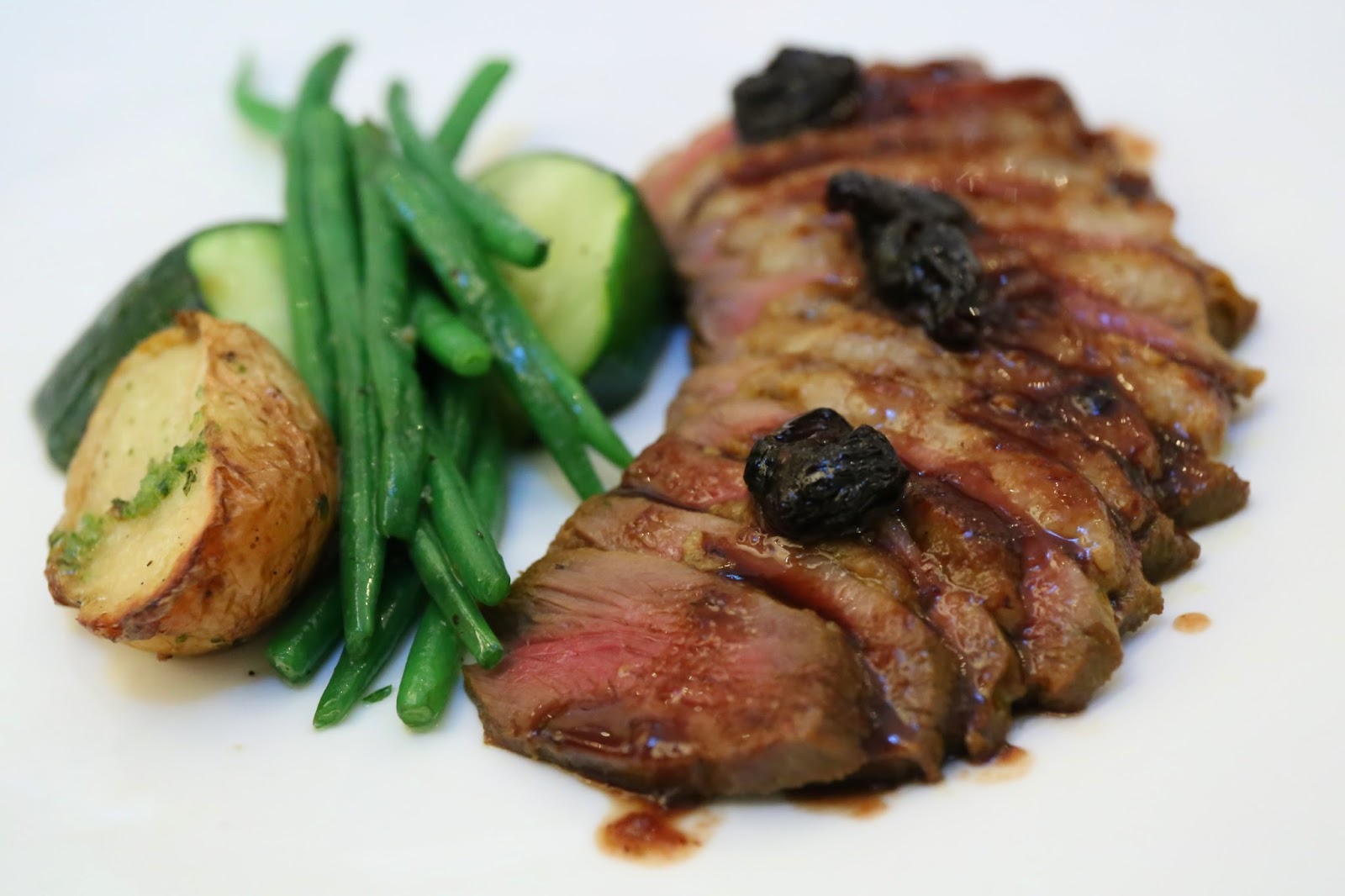 Grilled French duck breast with sun-dried cherry sauce - this was OK. I think the slices were a little on the thin side, which meant they didn't retain the heat as well and got cold pretty quickly. Flavor-wise this was OK, but the strips of fat under the skin seemed particularly yummy tonight... and for a few slices I was kinda savoring it.