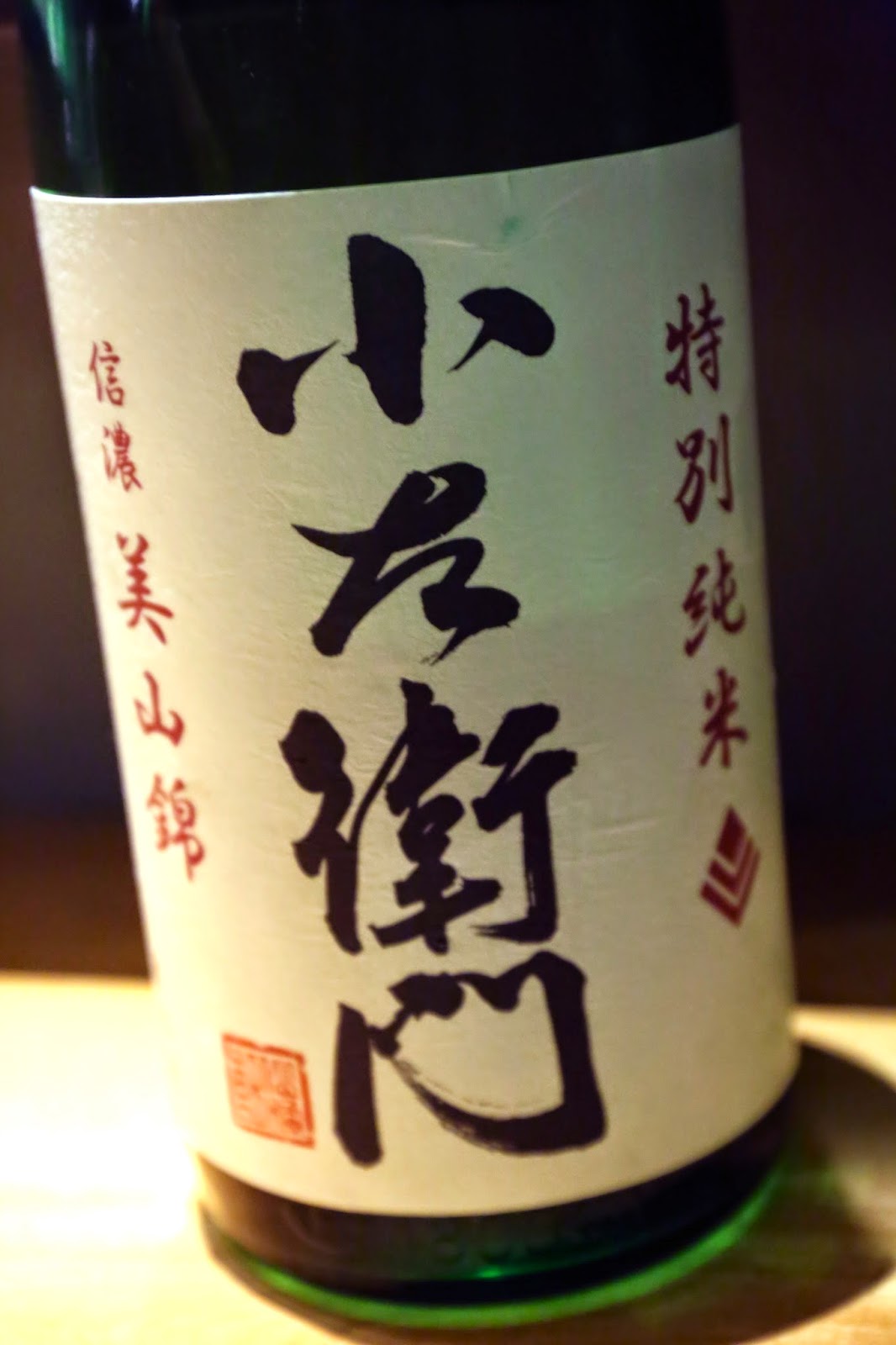 Kozaemon Tokubetsu Junmai Shinano Miyama Nishiki (小左衛門 特別純米美山錦) in issho-bin - very full flavors of fermented rice, good balance between sweet and dry. Seimaibuai (精米歩合) of 55%.