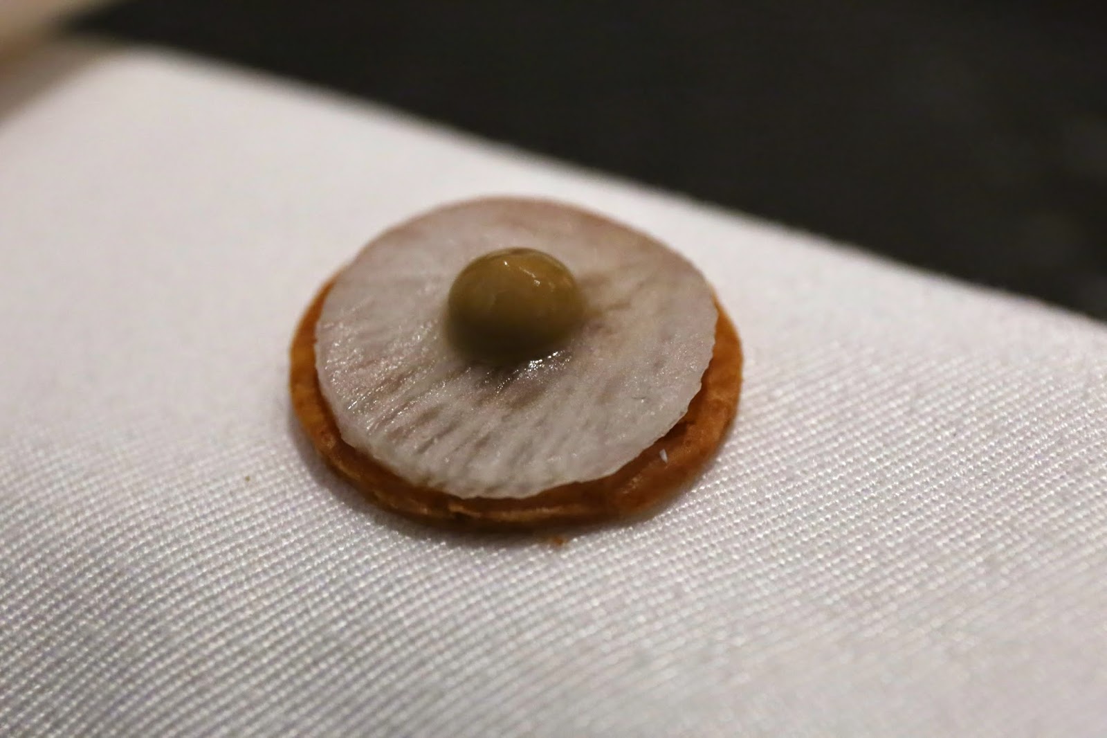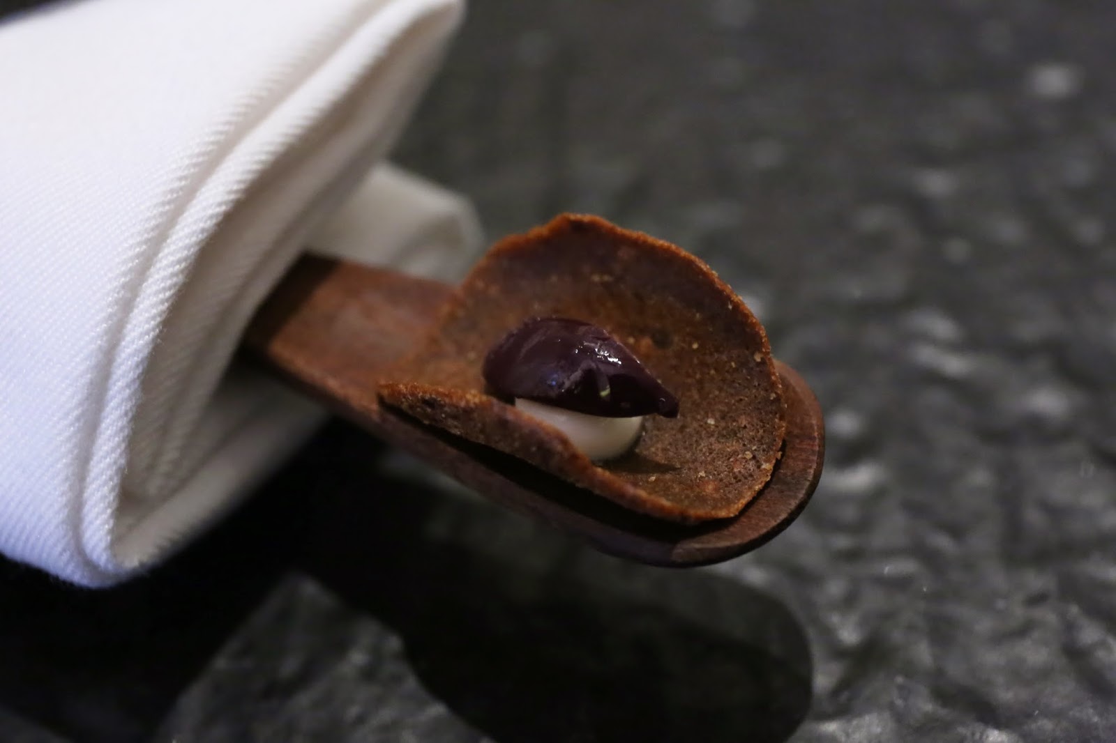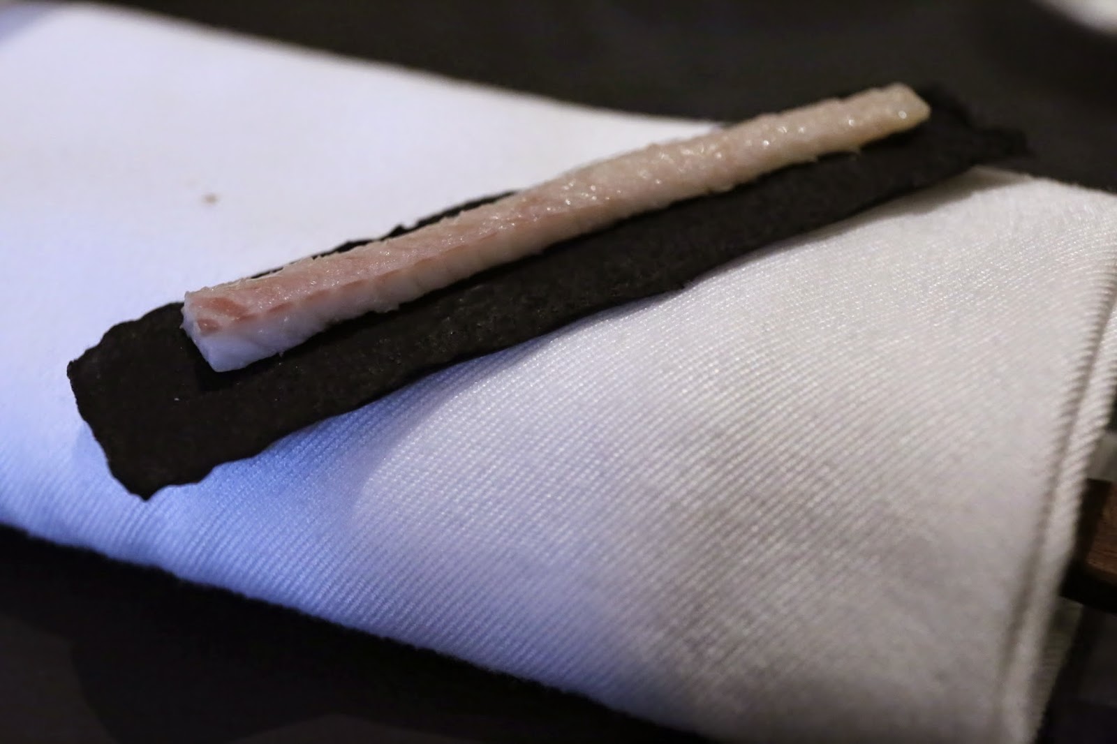 Squid ink and sesame crisp with smoked eel - I'm not sure why they changed things around, but the proportions tonight were all wrong. There's simply too much smoked eel here versus the crisp, and too salty as a result.