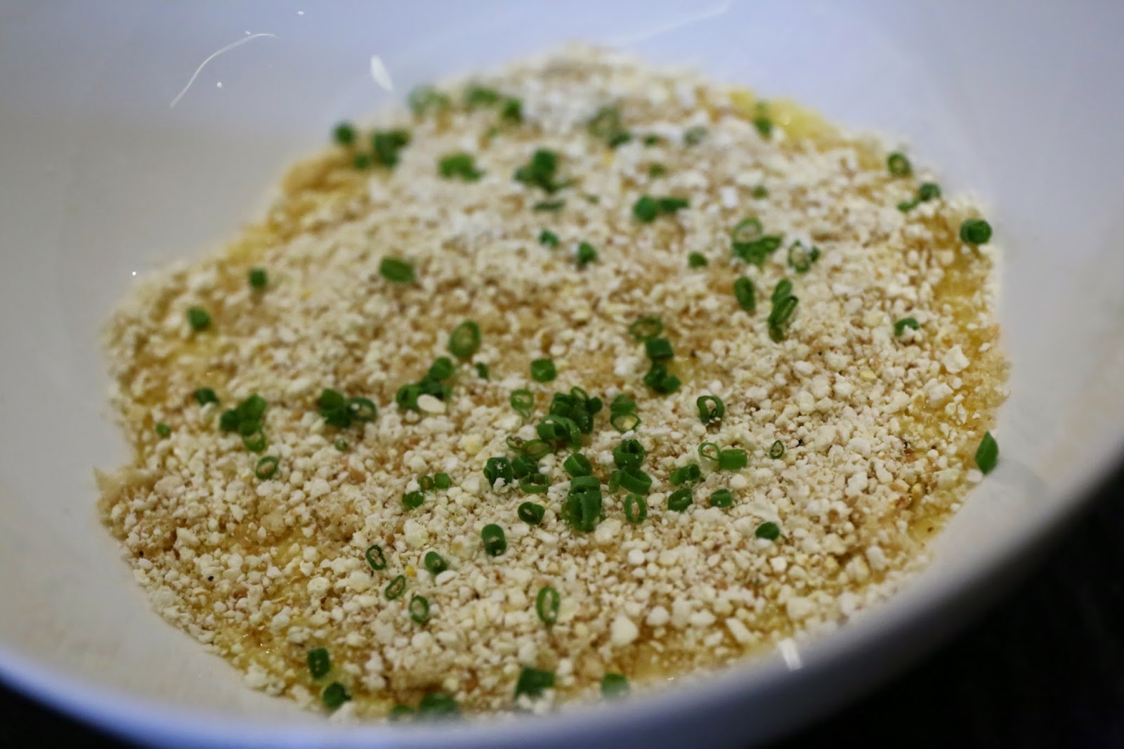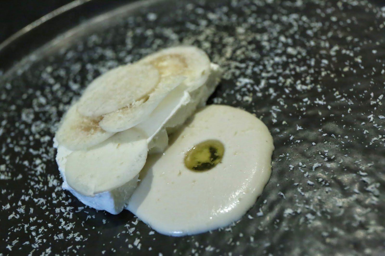 Goat cheese with white button mushrooms - the goat cheese had fairly high acidity, so it definitely needed the cashew cream and especially the honey to balance things out. The paper-thin wafers of white button mushrooms on top seemed interesting.