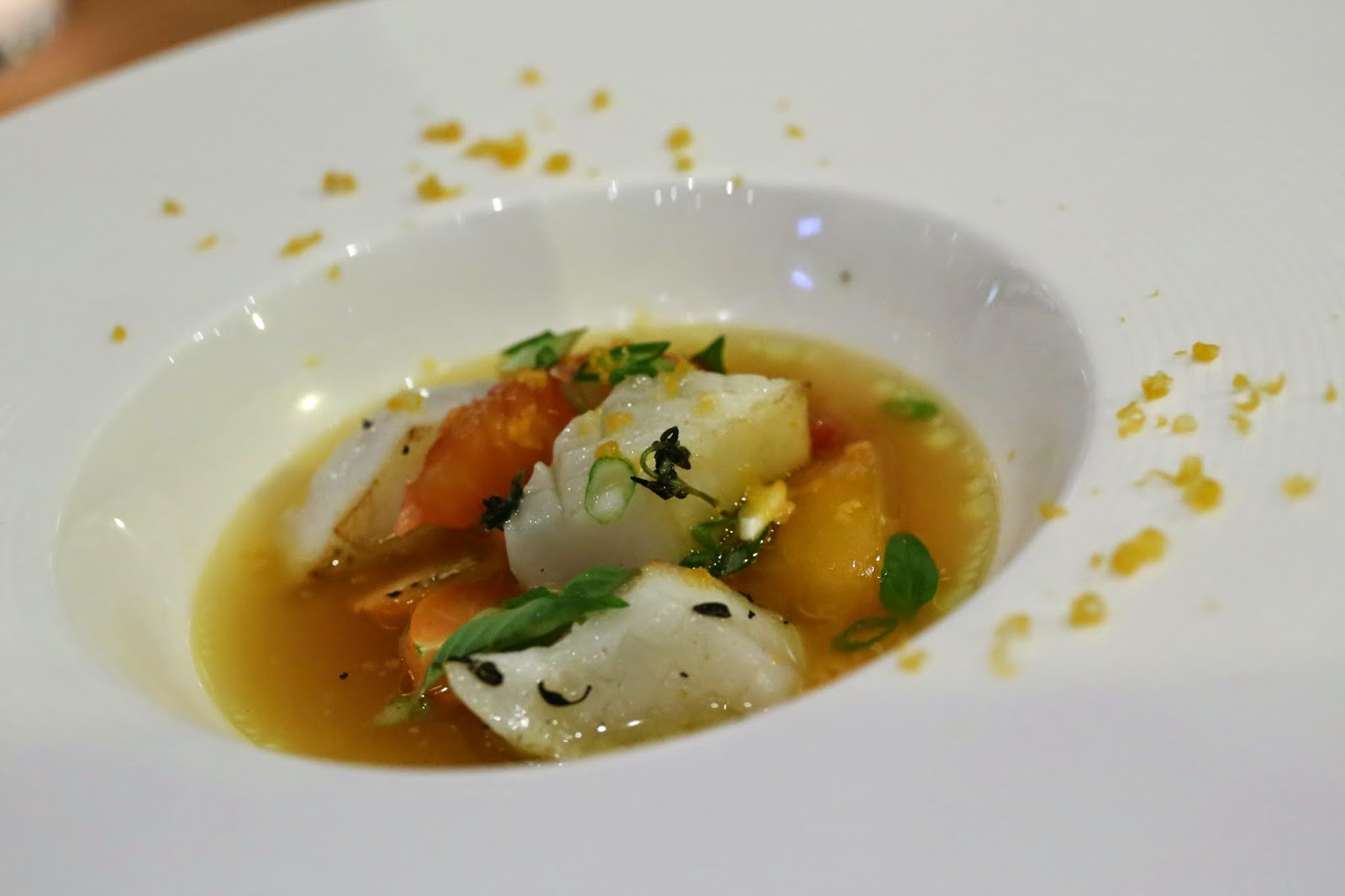 Cuttlefish_tomato_basil - the cuttlefish came in thick chunks, which were mi cuit while the scored exterior were a little dry from grilling. Nice and satisfying to chew on. Loved the shellfish bouillon, and there were cherry tomatoes, blood orange, onions and basil here to complement. And bottarga shavings on the side.