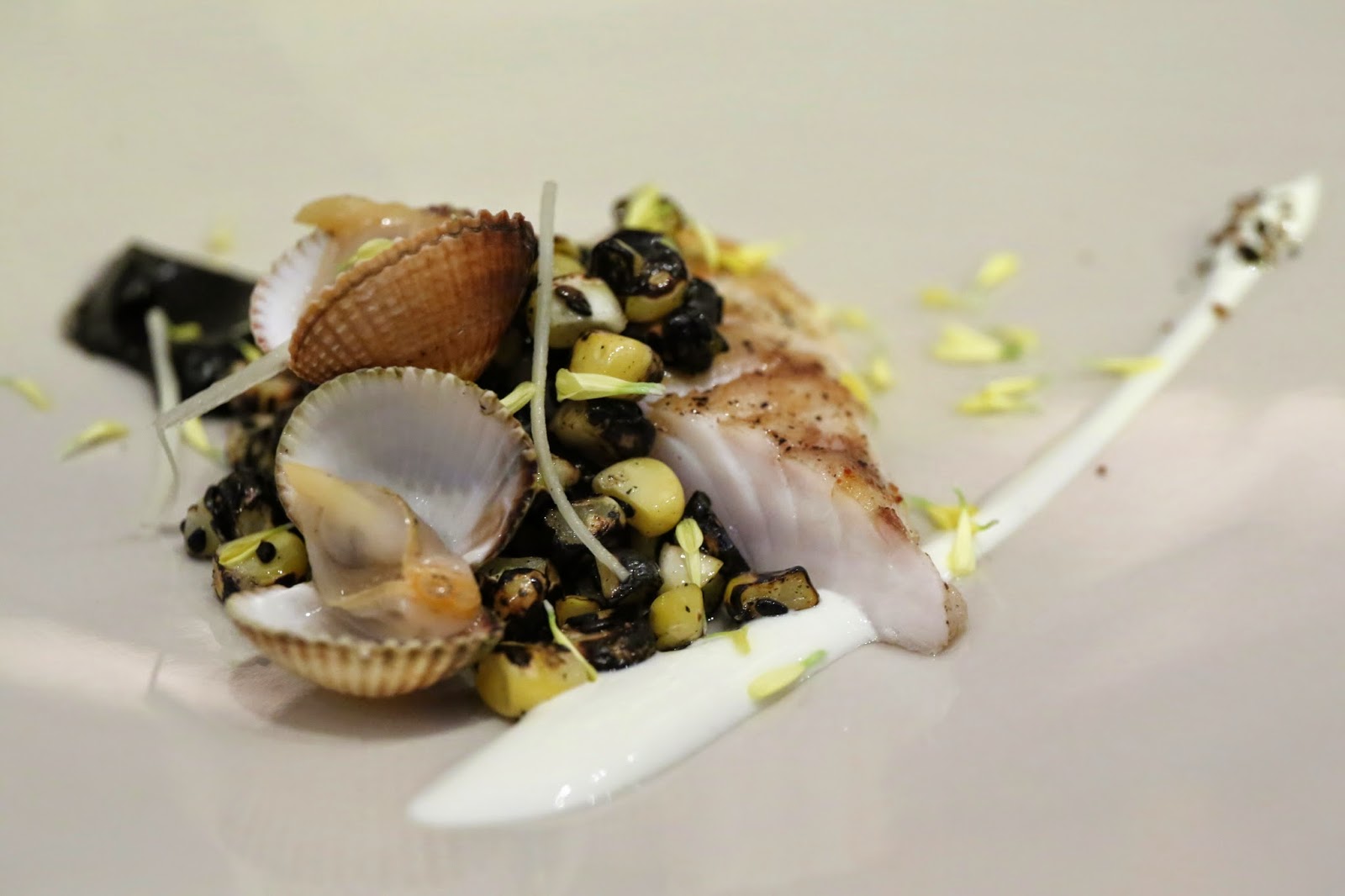 John Dory_corn_cockles - the John Dory was done with herbs like rosemary, and I didn't really get it. Not a fan of cockles, either. But the young corn was really sweet and yummy, and the squid ink and yogurt sauces were interesting.