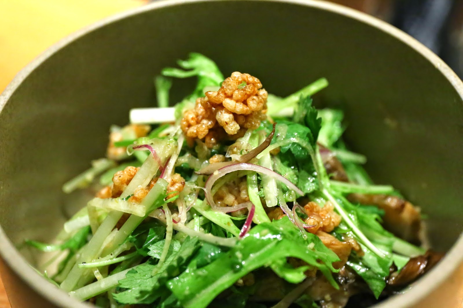 Maitake, cucumber, myoga, pickled garlic tosazu, crispy rice - the maitake has been marinated - in Tosazu (土佐酢) perhaps? - and was a little too acidic. Again served with mitsuba. I guess Matt really likes this particular ingredient...