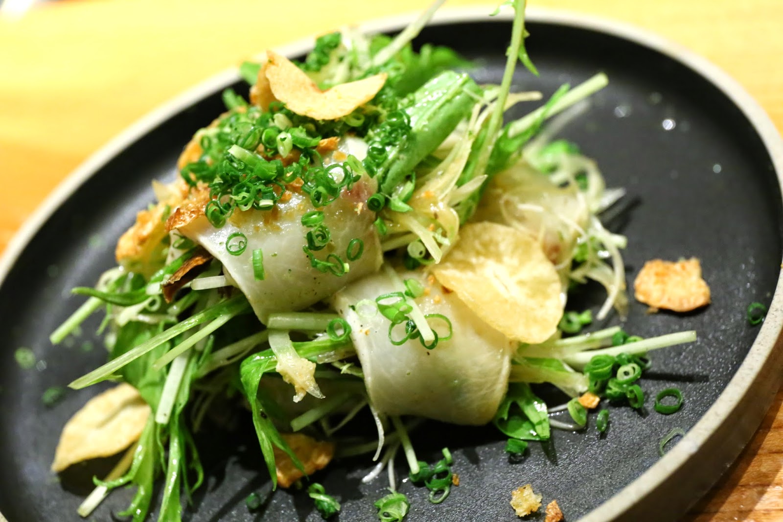 Sugi black kingfish sashimi, maitake, yuzu kosho - don't think I've ever had black kingfish before, and it was OK. With maitake (舞茸), onions, mitsuba - or was it mizuna (水菜)? - and fried garlic chips.