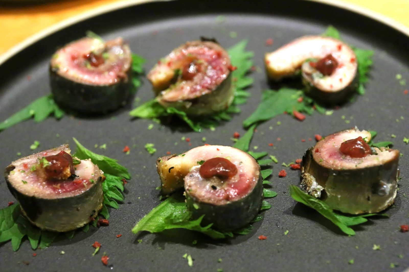 Saba, ume, mentaiko, shiso - soooo nice. Love the smoky flavors. Mackerel was cooked perfectly and was very tender. Rolled around a little bit of mentaiko (明太子), topped with some plum sauce and sitting on top of perilla leaves. Of course ume shiso (梅紫蘇) is one of those classic combinations that were made in heaven.