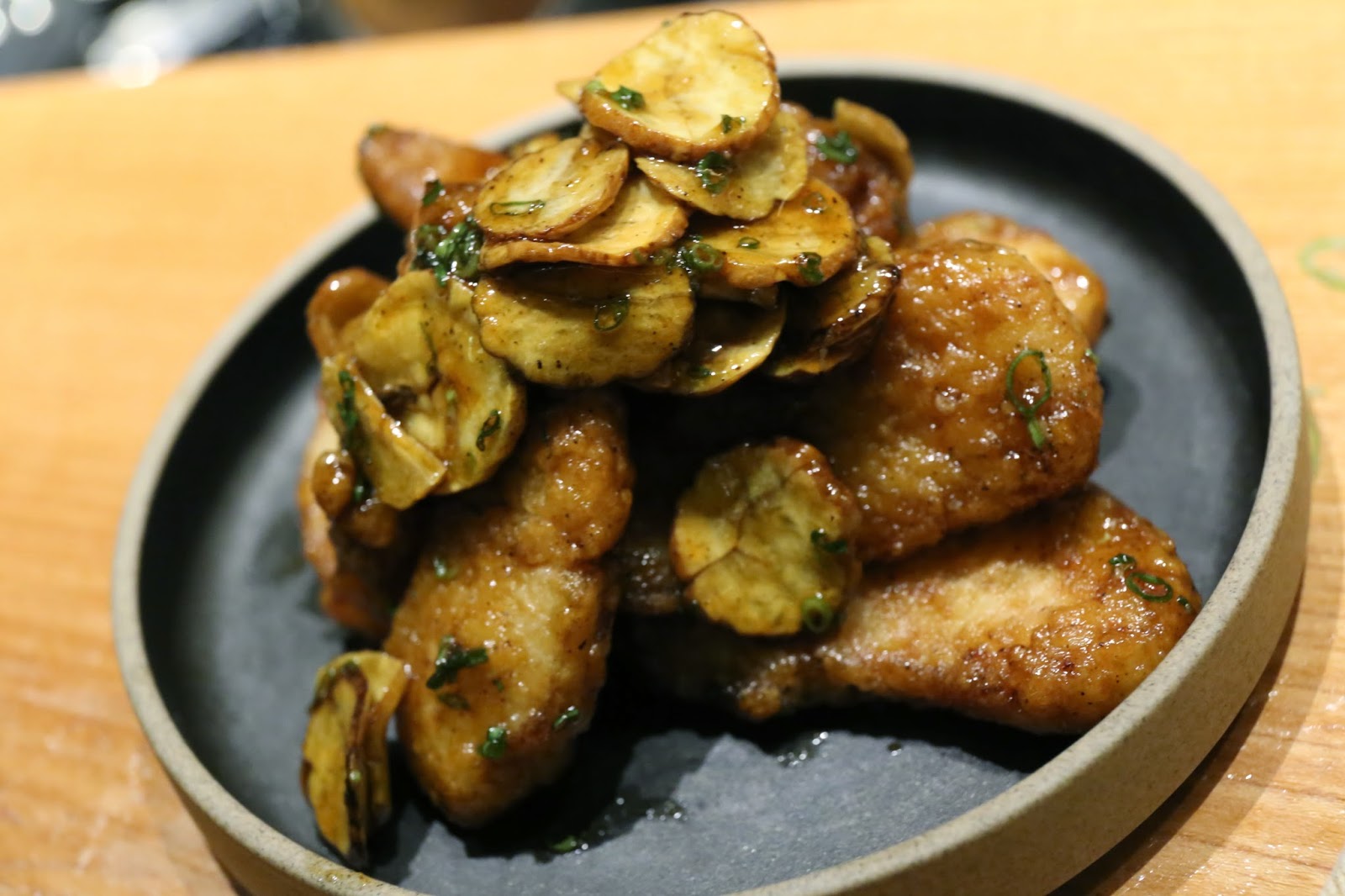 White ale battered kisu, yuzu kosho mayo - the batter was made with the Hitachino Nest White Ale (常陸野ネストホワイトエール) that I was already drinking, and was pretty good. They actually poured us a little bit of the ale on the side to make the natural pairing. The Japanese sillago (鱚) was yummy. We got the fish, the ale, so we were just missing some chips...