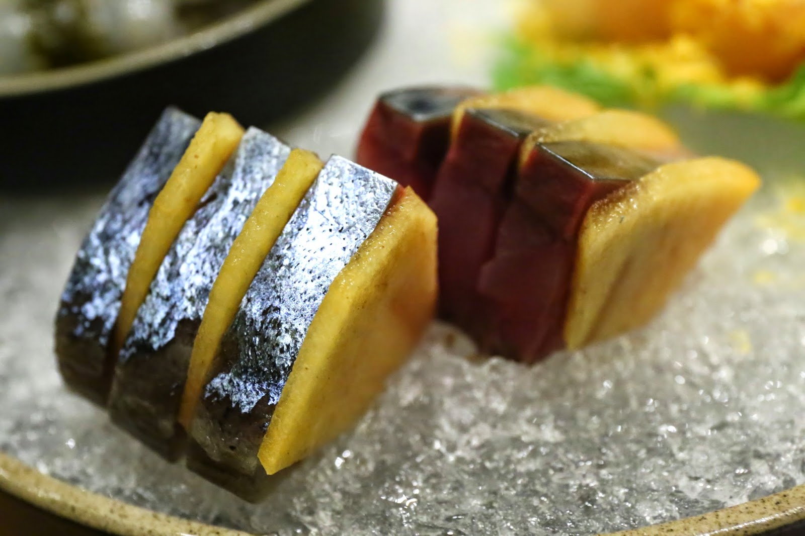 Saba mackerel sashimi, persimmon, smoke - love mackerel. Love persimmon. 'Nuff said.