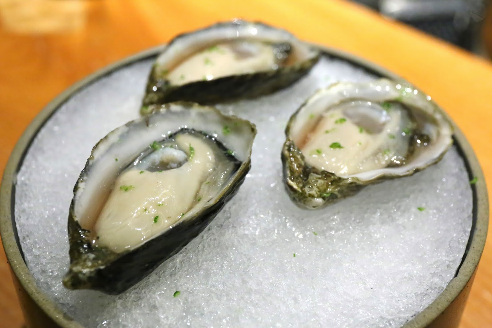 Shigoku oyster, red shiso vinegar, sudachi - always yummy. One bite. Great balance of acidity, creaminess and briny flavors.