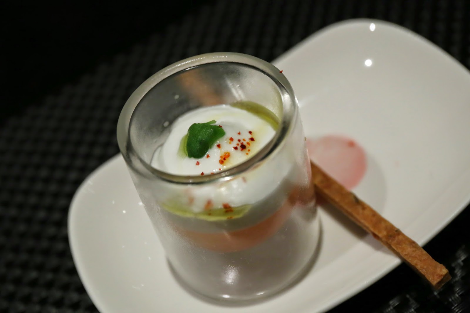 The amuse bouche was tomato gelée with a layer of pesto, topped with some mozzarella mousse. With a rosemary stick on the side.