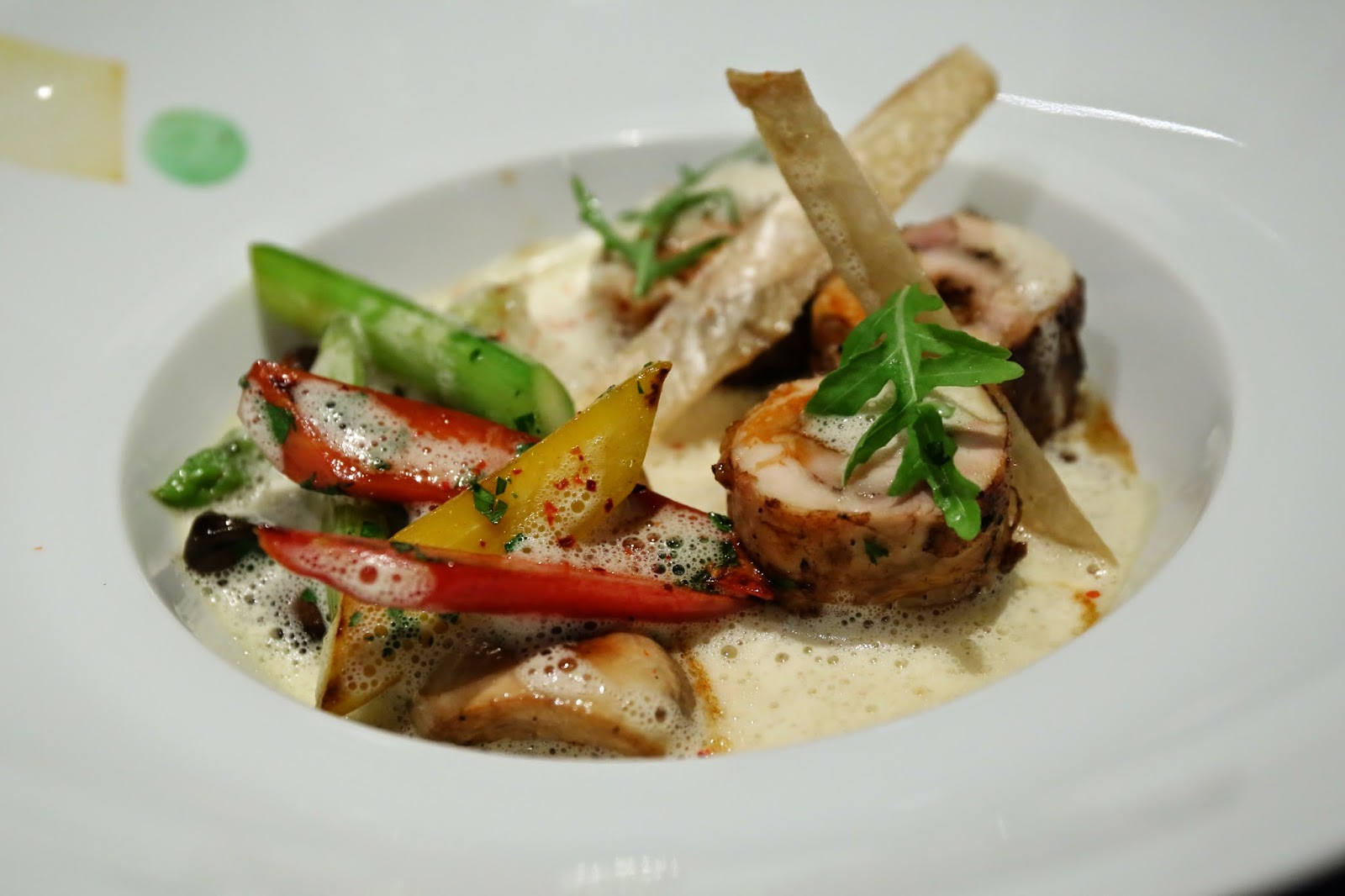 Le volaille la cuisse rôtie, aux asperges vertes et champignons - pretty interesting. The chicken thighs were very tender, and the foam was made with Shaoxing wine.
