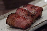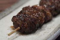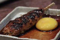 Tsukune: chicken and egg, handmade - normally this is my go-to item at any yakitori joint, but I passed this up in favor of something else tonight. However the waitstaff got my order wrong, and the manager decided that we should have it anyway… Always love the chopped bits of cartilage inside, and the raw egg yolk, too.