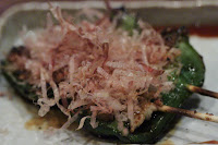 Tsukune Piiman: green peppers, chicken stuffing, katsuo flakes - this was what I actually ordered instead of the ordinary tsukune (つくね). Kinda interesting.