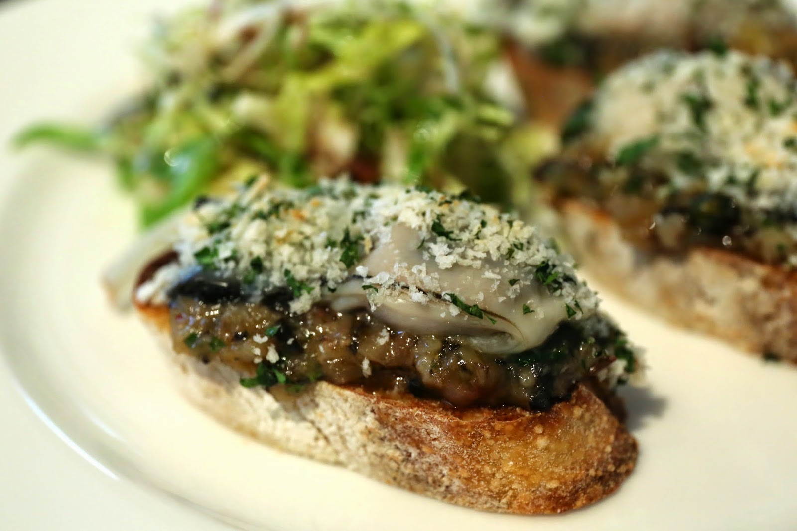 Pig trotter and oyster toast - diced pig trotter confit, with black beans, poached oysters and topped with chopped green herbs and Parmesan bread crumbs. I could pick out the distinct flavors of cumin, and I think there were a couple of drops of truffle oil. Pretty interesting mix of ingredients, and surprised at the use of black beans... especially since white beans is more common in traditional French stews. I was also surprised that the oyster ended up dominating the flavors.