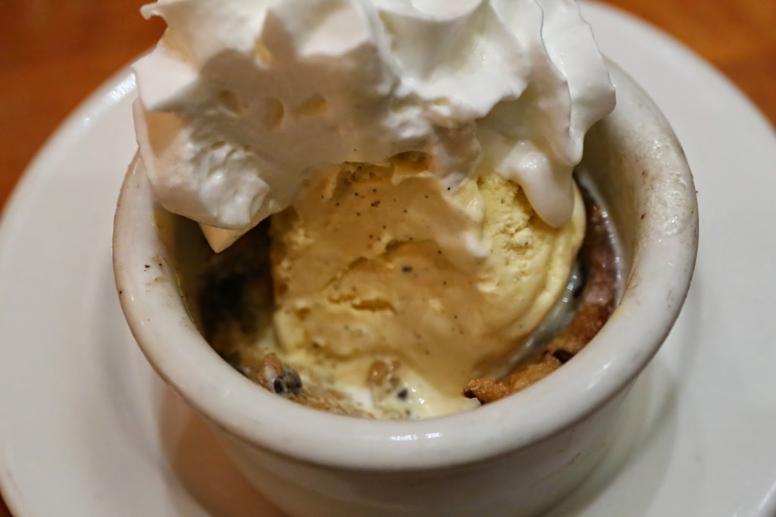 Chocolate chip pizza - also a personal size. The menu led me to think it was something a little more special, but it was just a single chocolate chip cookie that came in a ramekin, topped with a scoop of vanilla ice cream and whipped cream. Not bad, but nothing really special.