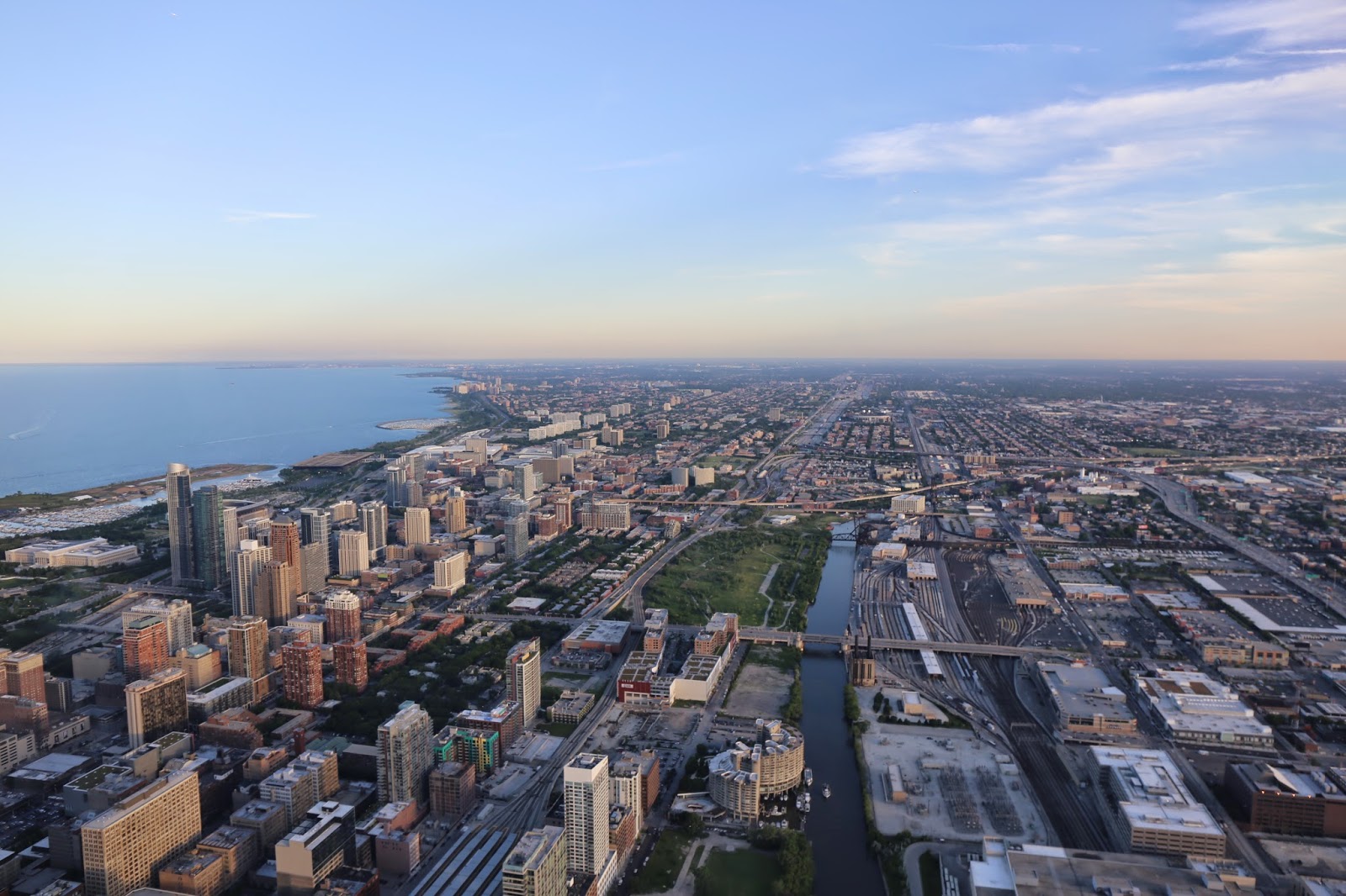 The view was definitely spectacular. I started by looking south, following the Chicago river down, with Lake Michigan on my left. It was 7:30 p.m. but there was still plenty of light.