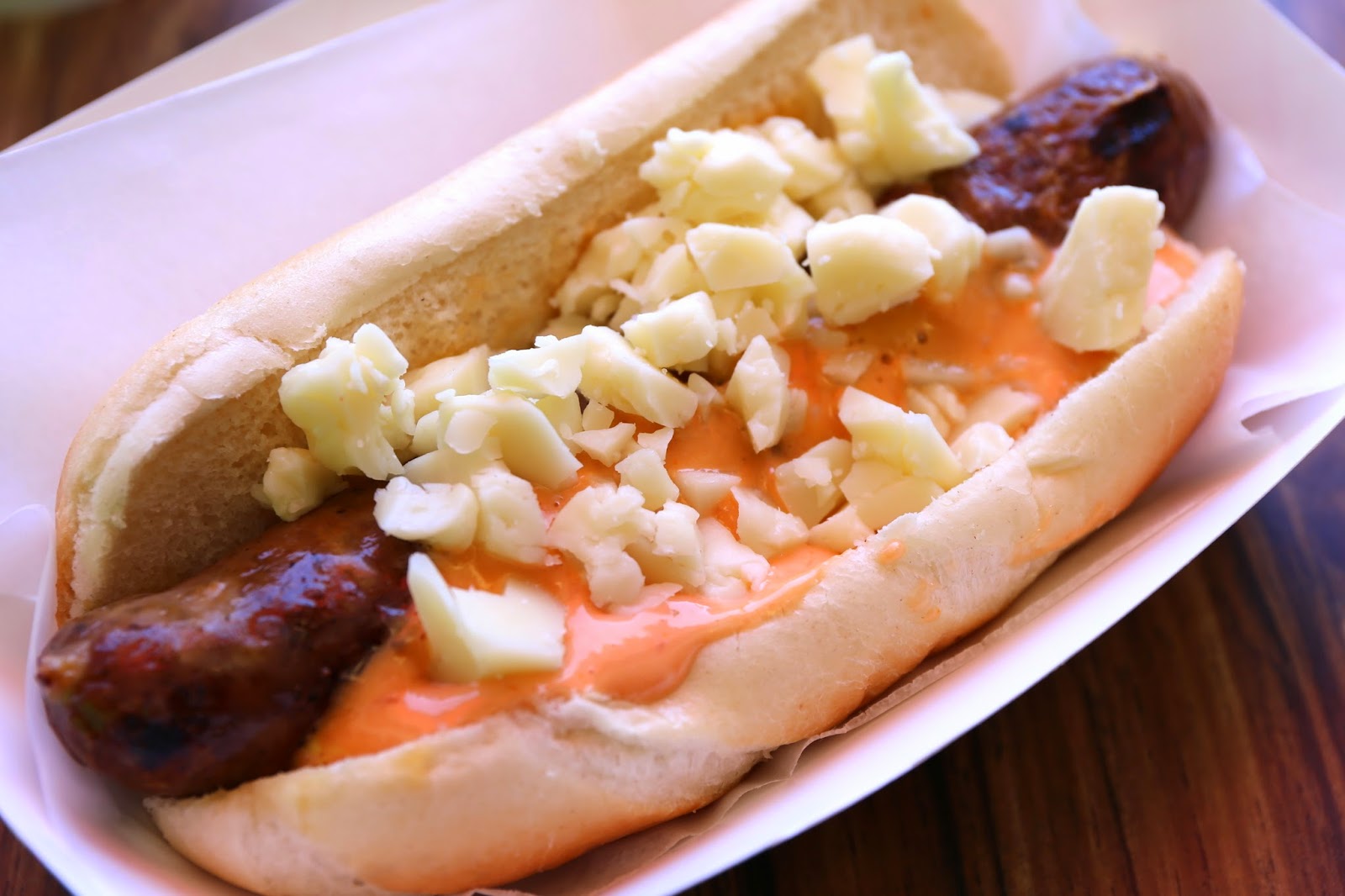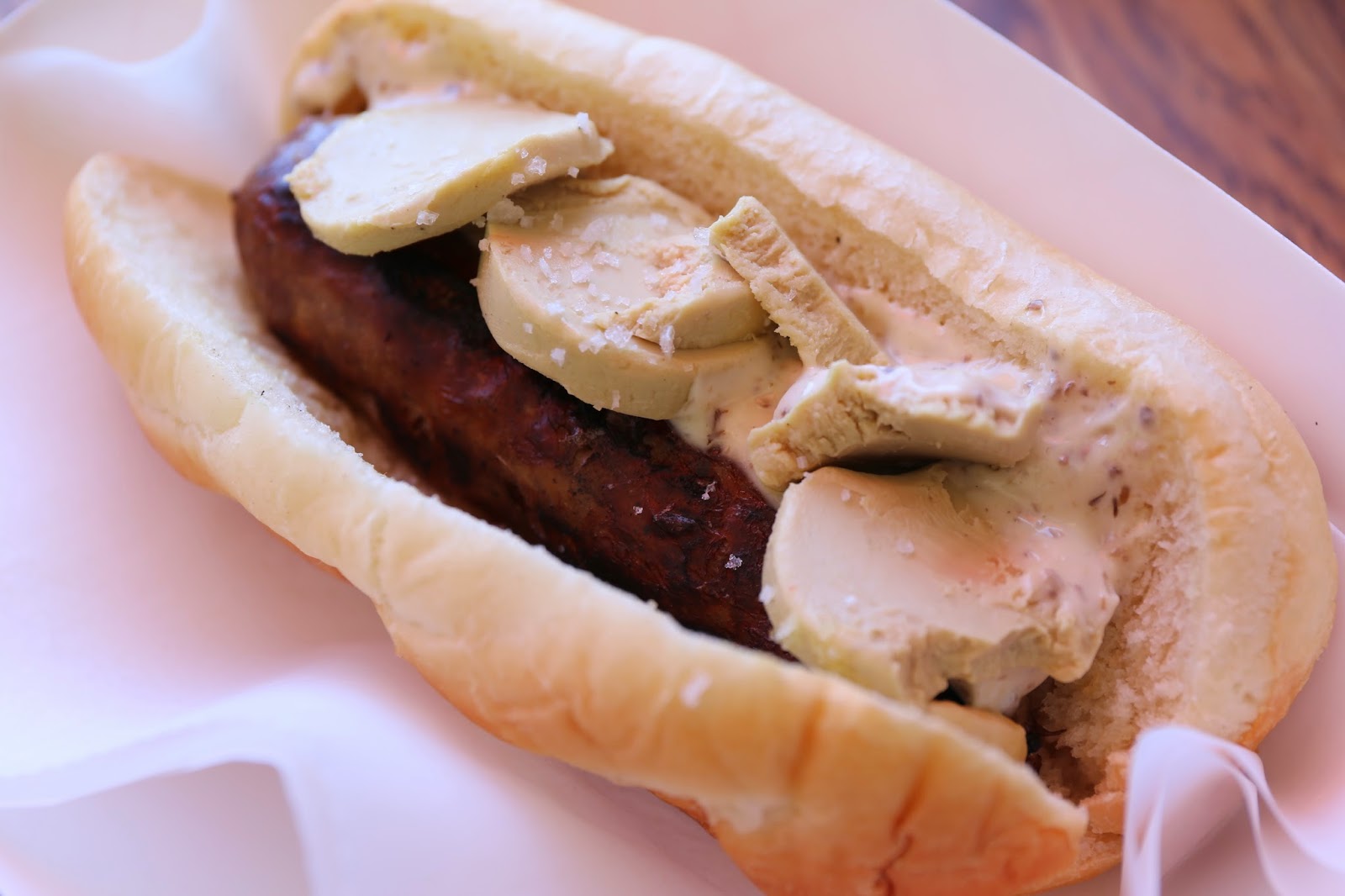 Foie gras and Sauternes duck sausage with truffle aioli, foie gras mousse and fleur de sel - the signature sausage. I forgot to ask for toppings, so I was getting it "as is". The duck sausage itself was very, very good. In fact, I don't remember having a better, tastier sausage other than the ones where my friends made it themselves. I think the Sauternes definitely gave the duck meat more depth in terms of flavors, like the way Mei Kuei Lu (玫瑰露) adds a little something to Cantonese sausages.