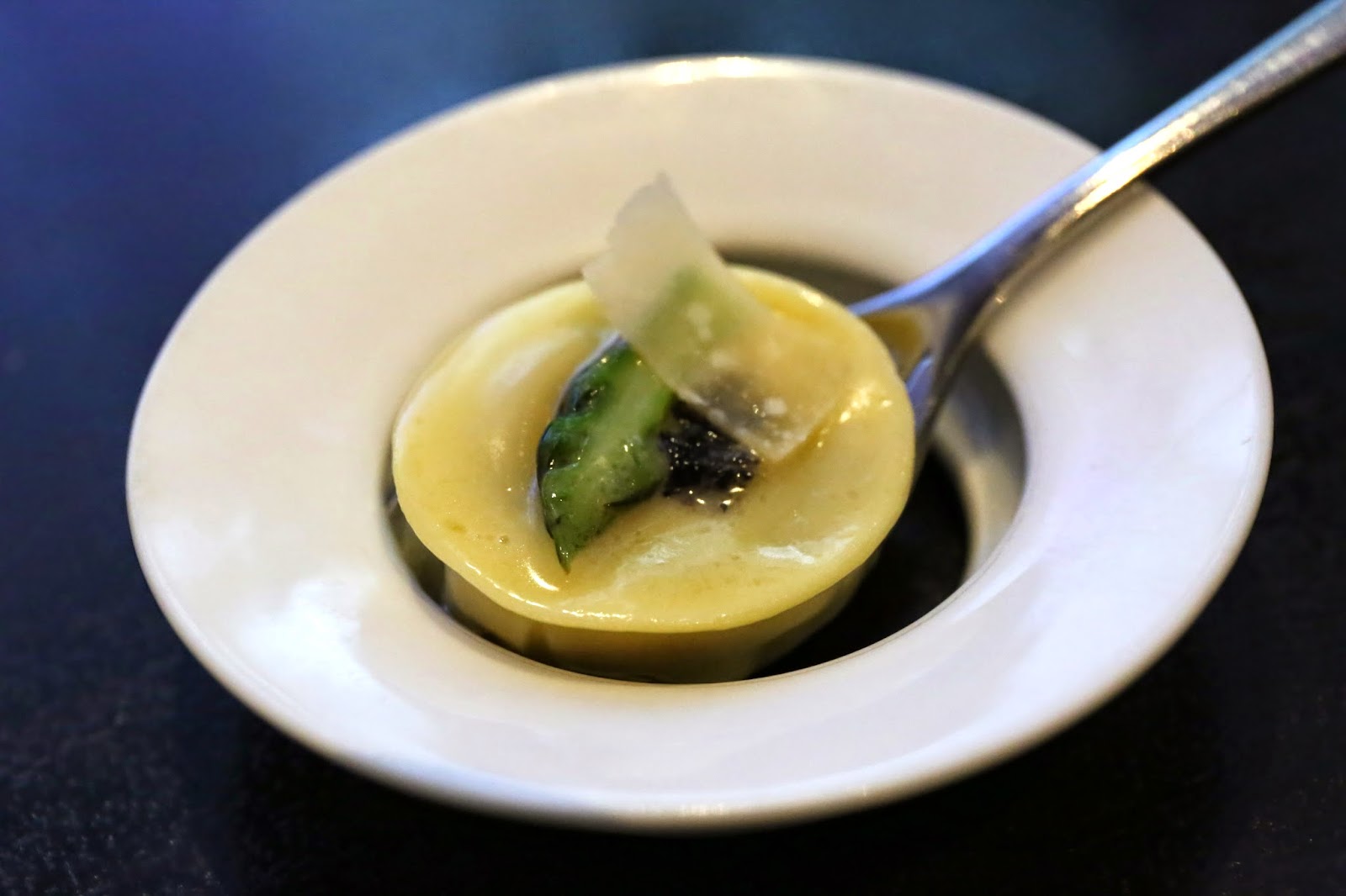 Black truffle: explosion, asparagus, parmesan - a little ravioli with a liquid black truffle filling, topped with the tip of an asparagus spear and a thin slice of Parmesan. Yeah, this was very salty, too.