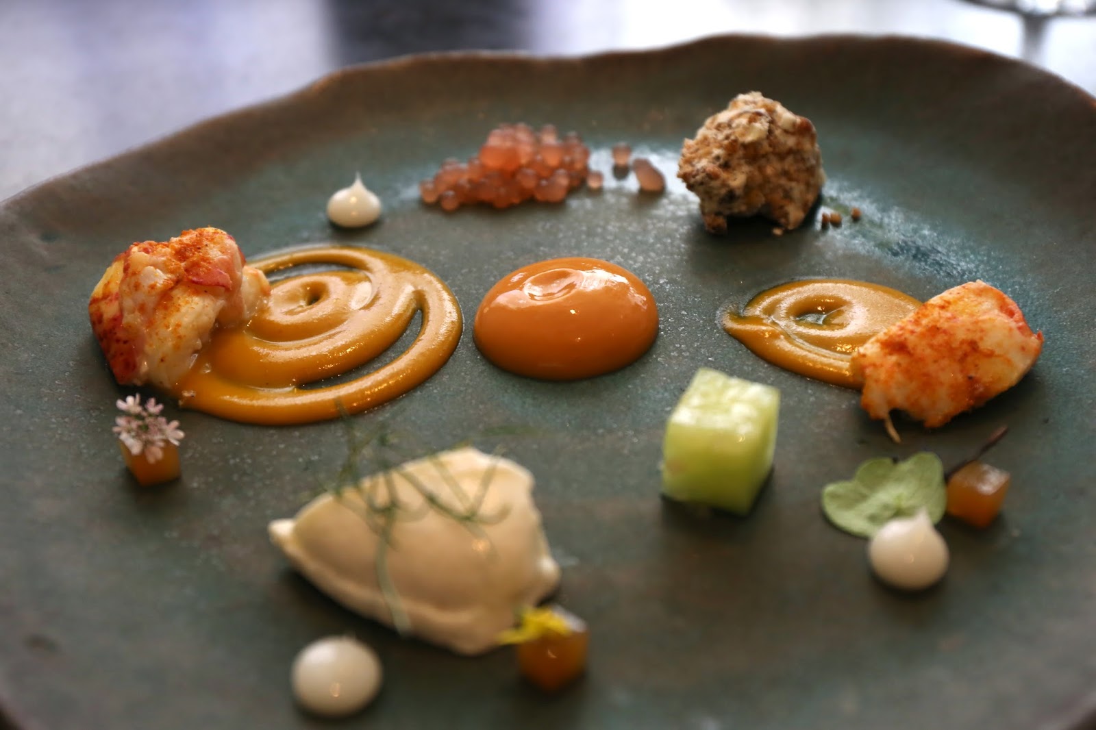 Lobster: curry, earl grey, grapefruit - the lobster claw and tail were seasoned with Indian curry sauce, with a very tasty lobster bisque in the middle. On the sides were little coconut dots, spherical grapefruit pearls, Earl Grey cubes, compressed cucumber, a clump of wild rye crispies, and a custard made with cauliflower and vanilla. Interesting, but not sure why all these diverse flavors were put together on the same plate.