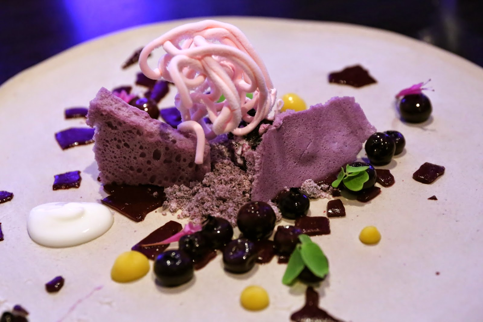 Blueberry: bubblegum, lilac, sorrel - blueberries done multiple ways - including crunch, powder...etc., with bubblegum noodles, lilac, yogurt, blood orange dots and sorrel leaves.