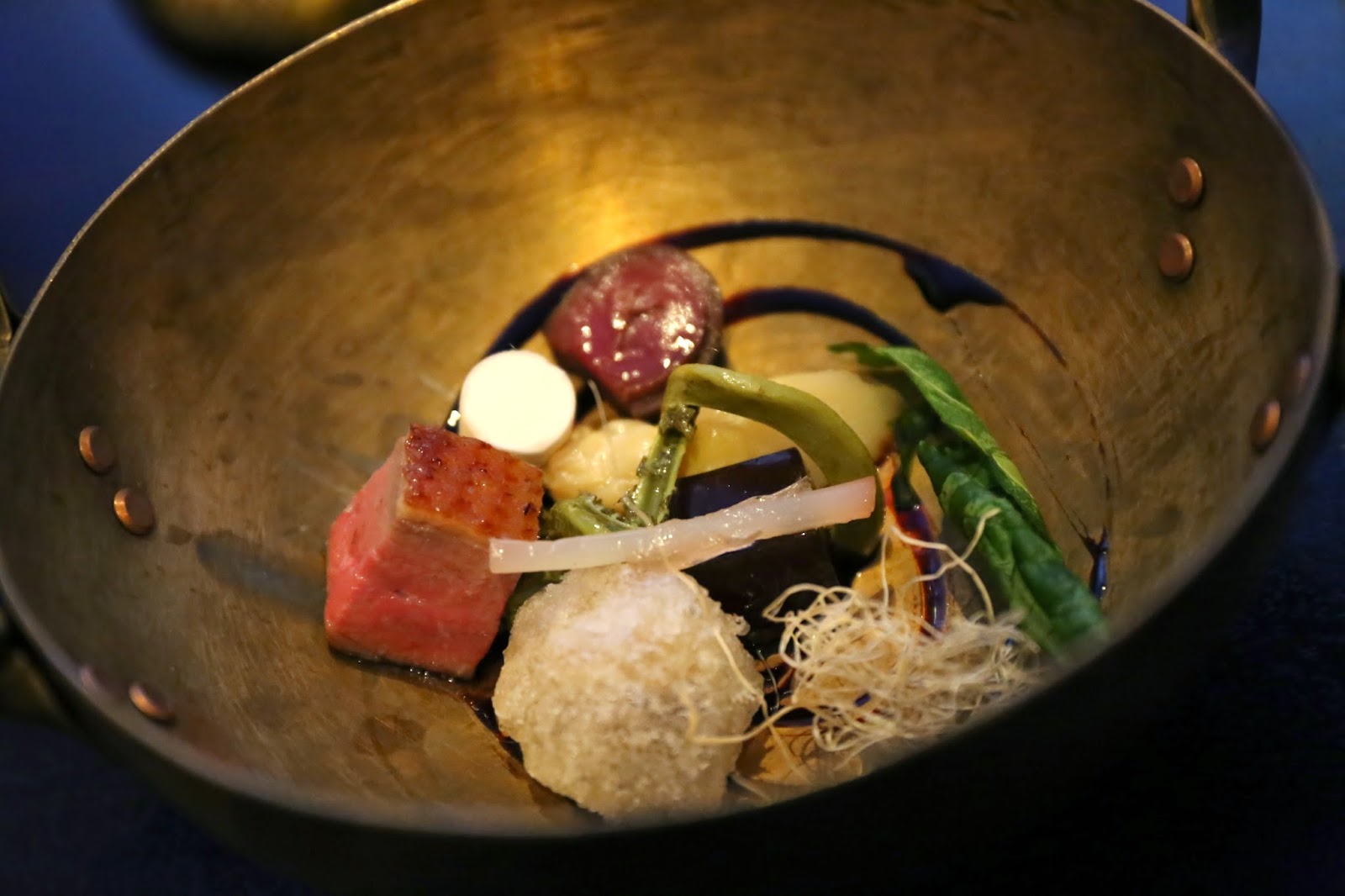 This was supposed to mimic the American Chinese dish of orange chicken (eh? I always thought it was lemon chicken or orange beef?!), except they used veal sweetbreads which had been battered and fried. I could have sworn that there was Chinese five spice (五香) here... There were also dehydrated spring onions, heart of palm, ginkgo nuts and pickled crosnes (寶塔菜) - which turned out to be surprisingly crunchy without cooking. A very playful dish.