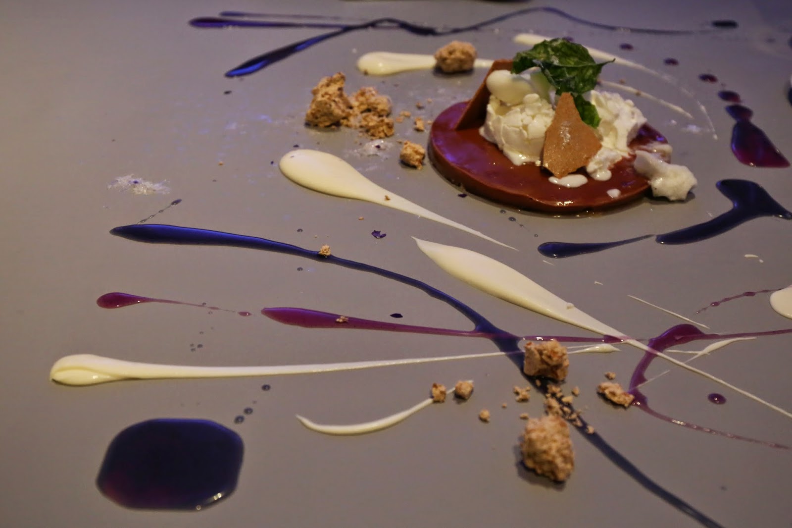 Milk chocolate: pâte sucrée, violet, hazelnut - the original version of Uwe's various painted desserts is from here. The centerpiece was made with pâte sucrée, armagnac butterscotch and milk chocolate pudding. The frozen meringue on top was a little weird, and almost tasted a little salty or ammonia. Nevermind the candied basil on top. On the sides were sweetened crème fraîche, violet puddles, frozen hazelnuts and brown brittle. I really enjoyed the chocolate pudding with the butterscotch...