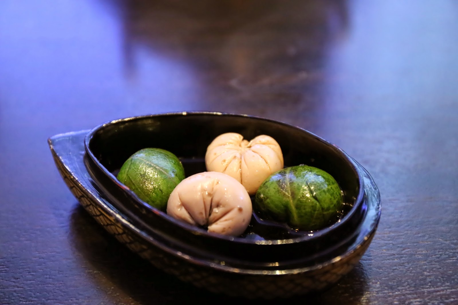 Then there was a duck-shaped container, whose top was removed to reveal these little dumplings... The green ones had morel mousseline wrapped with perilla (紫蘇) leaves, and the white ones were duck mousseline and foie gras.