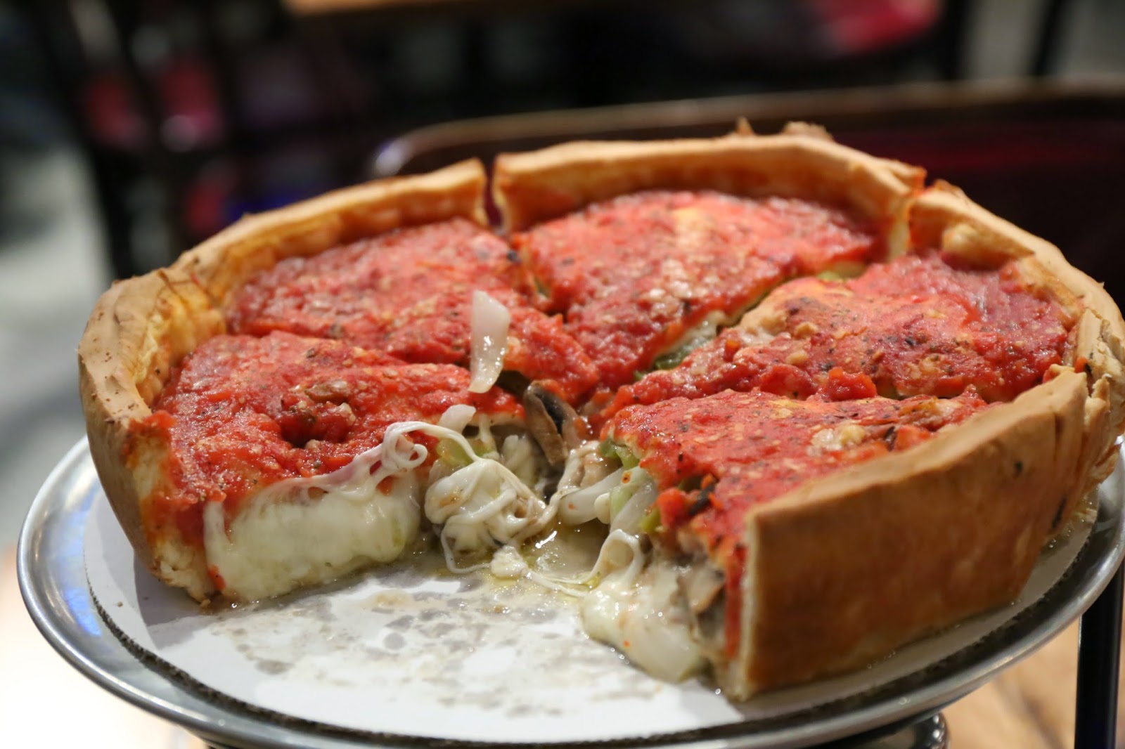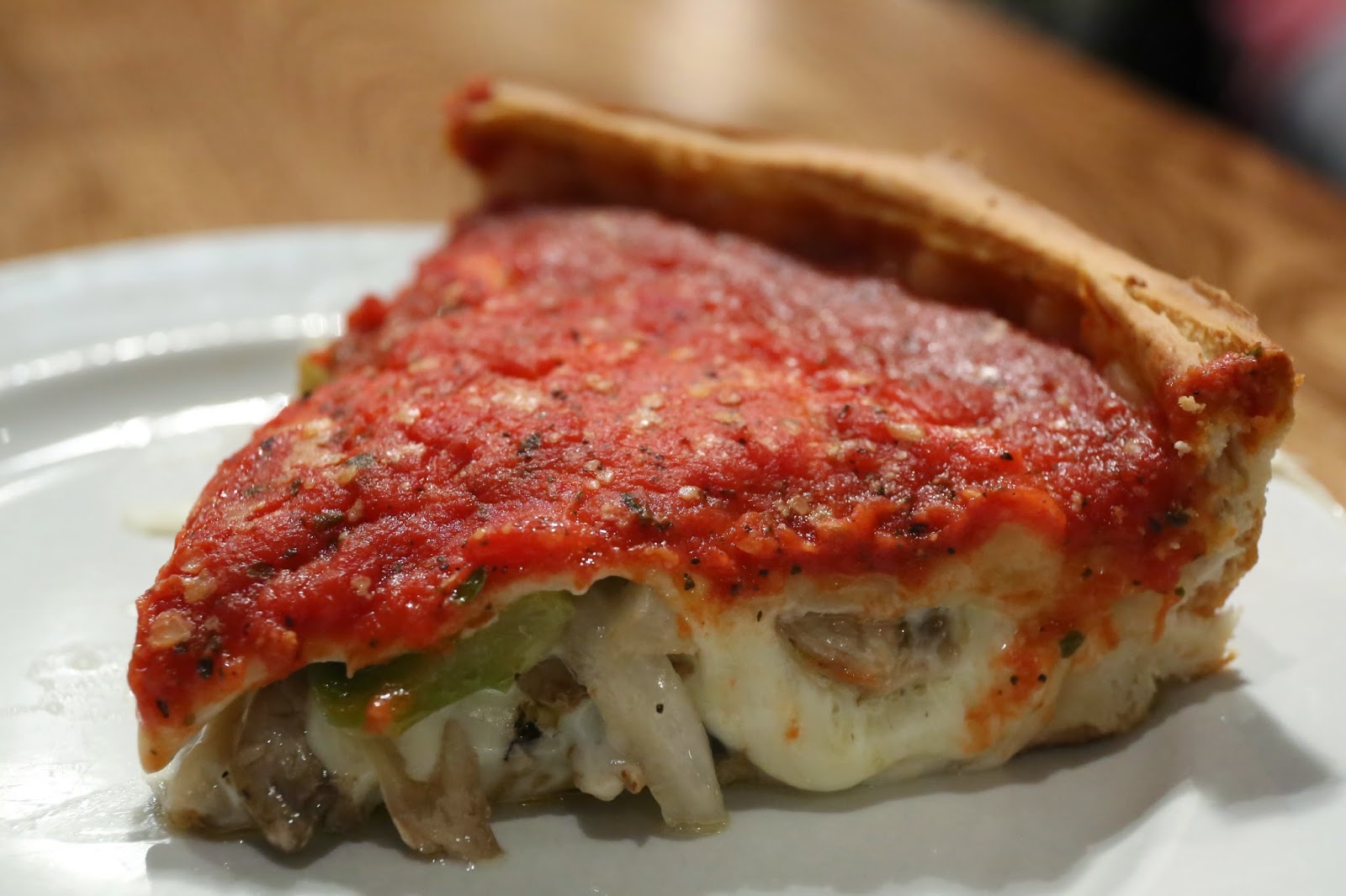 The word is that this isn't technically "deep dish", but they call it "stuffed pizza" because, unbeknownst to many, there is a very thin layer of dough right at the top, just below a thin layer of sauce. It's soft so it can be mistaken for a layer of cheese, but I actually stretched it to confirm that it's not cheese.