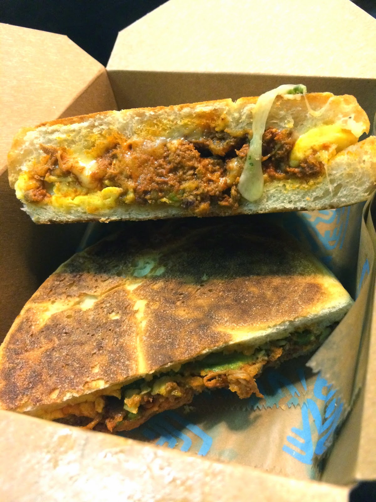 The thought that griddled sandwiches may be a little big for breakfast did cross my mind, but I still went for one. As it turned out the egg and chorizo torta was pretty tasty, and I even found myself pouring enough of the green chili sauce in the middle to get a little kick. Not bad.