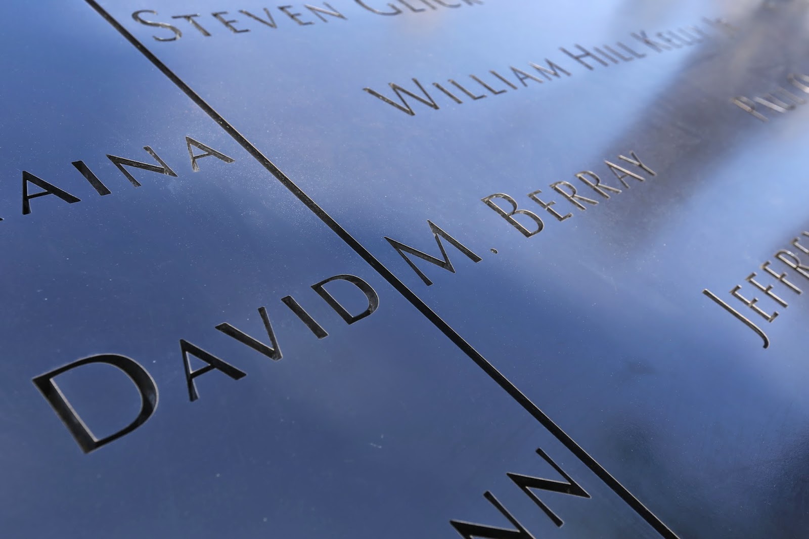 I abandoned the task temporarily and focused on snapping a few pictures of the North Pool, from various angles. After getting a few shots I wanted, I paused momentarily and my eyes focused on the section of the rim in front of me. There it was, the name I had been looking for. By coincidence, or perhaps there was some mysterious force at work which naturally drew me to it, I came upon it without making any effort at all. David M. Berray. The one name among thousands that meant something to me. Instinctively I reached out my hand to touch the engraved letters, wanting to make that personal connection. Tears welled up in my eyes instantly.