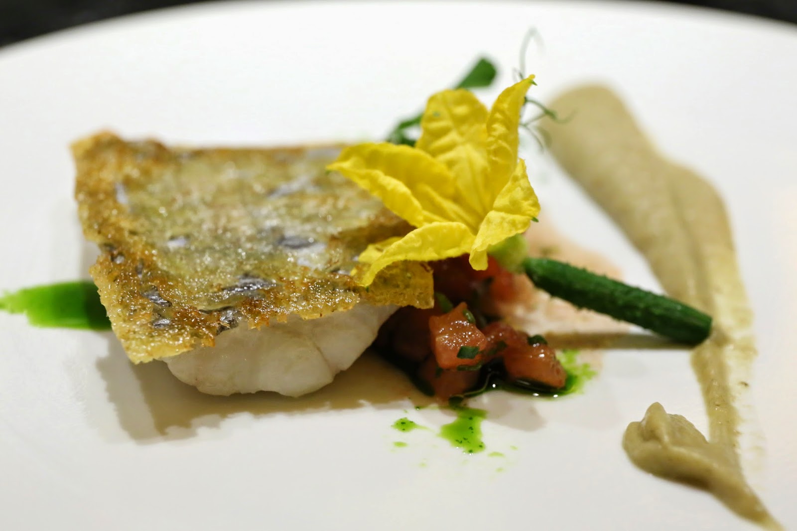 Pan-fried Japanese hairtail, fresh tomato sauce and eggplant puree (大刀魚のソテー、フレッシュトマトソース、茄子のピューレ) - I can't remember the last time I've had this type of fish at a high-end restaurant, but the texture really is much, much finer than your average cutlassfish that mom used to fry up when I was a kid. Of course the skin was perfectly crispy. Nice combination with the tomato and eggplant, as well as a little cucumber flower.