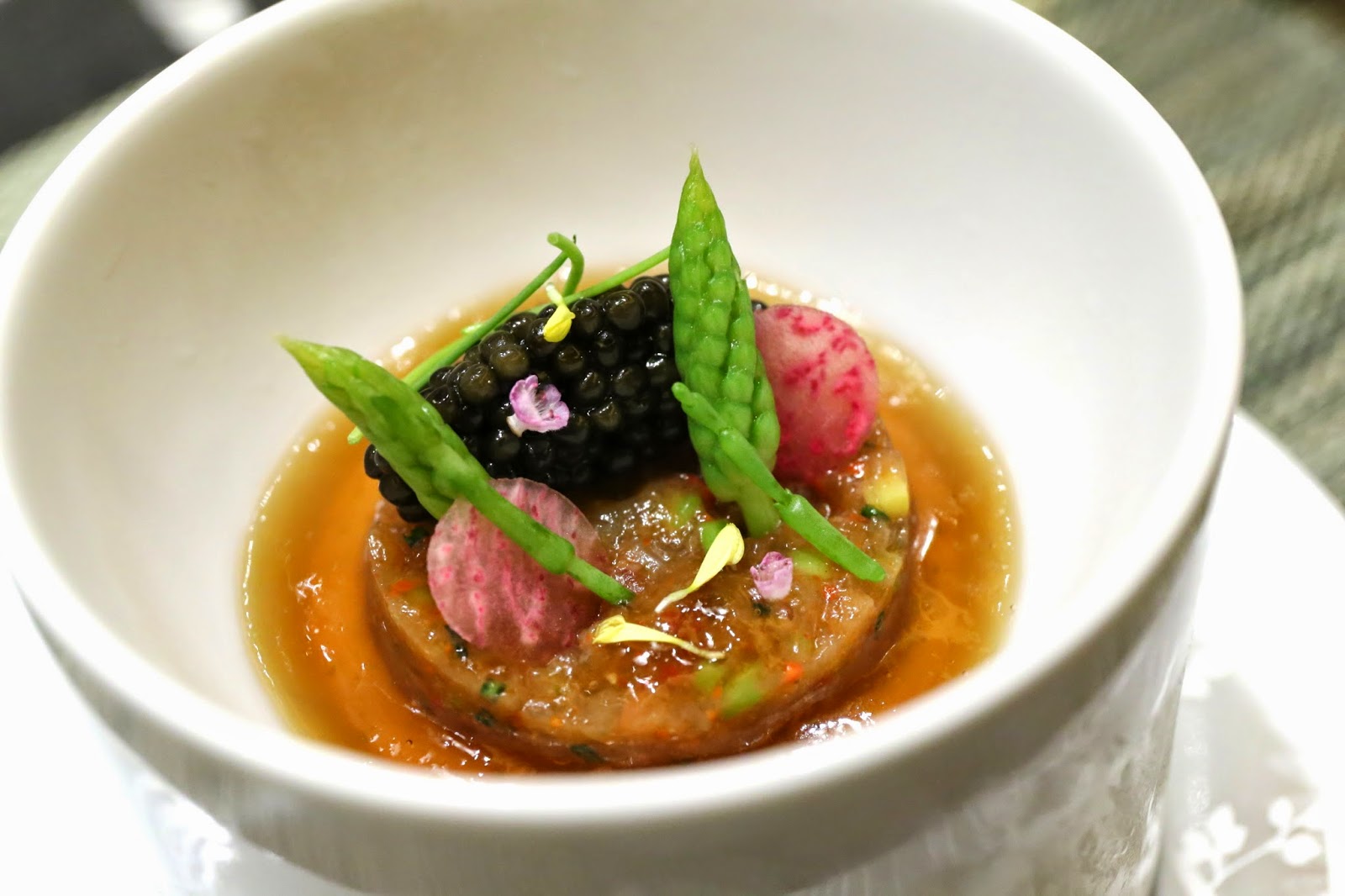 Boston lobster tartar with dill cream, lobster jelly and caviar (ロブスターのタルタル、ディルクリーム、ロブスターゼリー、キャビア) - a pretty good start to dinner. There was surprising crunch inside the lobster tartar thanks to some finely diced chives, and all the flavors from the jelly, caviar, dill cream...etc. worked together perfectly.