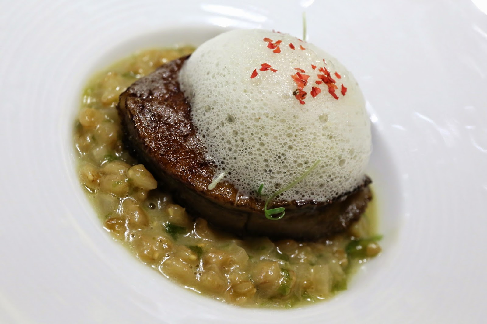 Japanese corn espuma with royale de foie gras custard (日本のコーンのエスプーマ、フォアグラロワイヤル) - very, very yummy. I looove Japanese corn, and when you put foie gras custard at the bottom of that cup... the combination was just killer. The corn stick had a thin line of corn purée and was sprinkled with bits of popcorn. I could do with another cup of this.