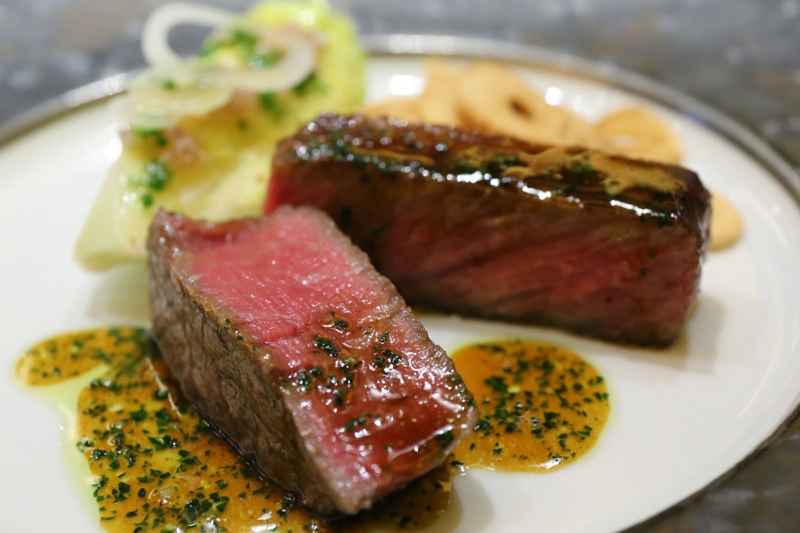 Charcoal grilled Hida wagyu tenderloin and teppanyaki Kagoshima sirloin (飛騨和牛テンダーロイン炭焼きと鹿児島鉄板焼きサーロイン) - how does one go wrong with marbled beef like this? Clearly the tenderloin would be a little leaner, but no less "tender", juicy and delicious. The sirloin was melt-in-the-mouth as expected - a beautiful example of what Japanese beef can achieve. I was happy taking the beef "as is" with the truffled jus, but also dipped in the black pepper sauce just for comparison's sake. Of course, I had to pick up the deep-fried garlic chips one by one and nibbled on them...