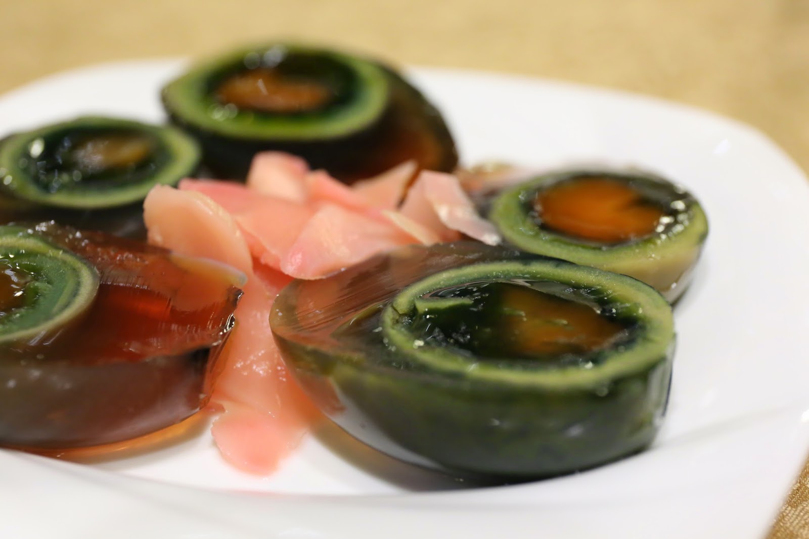 First came the century eggs with pickled ginger (皮蛋酸薑). Not liking the half that I took today... The chemical/ammonia flavors were a little too much.