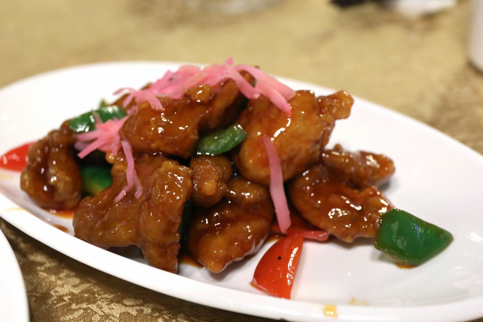 Sweet and sour pork with hawthorn (山楂咕嚕肉) - the classic version made with hawthorn berries and pickled ginger. Pretty good, and not too much sauce.