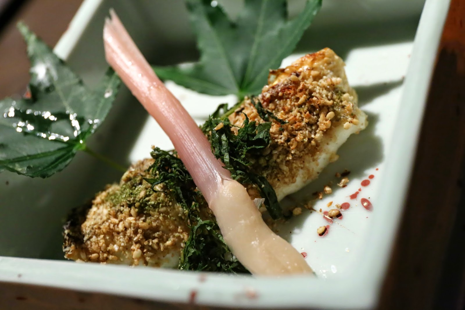Grilled dish: perch, perilla flowers, white sesame seeds, sansho powder, ginger (烤品:鱸魚香味燒 紫蘇花 白芝麻 粉山椒 薑筆) - pretty decent, and the "crust" on top was very fragrant and made the dish.