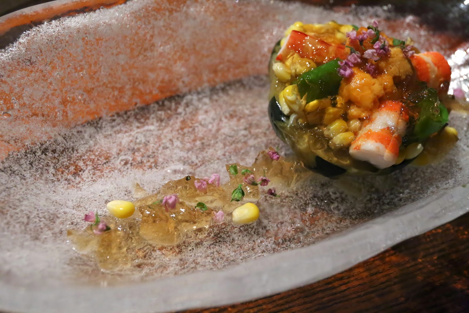 Cold dish: Kamo eggplant, sea urchin, prawns, shishito pepper, corn, perilla flowers (冷砵:賀茂茄 海膽 明蝦 獅子辣椒 玉米 紫蘇花) - I've always loved those big, round Kamo eggplants from Kyoto, and today I got half of a big one. The topping included deliciously chilled sea urchin and prawns, and a refreshing "salsa" of corn and shishito peppers (獅子唐辛子), topped with perilla flowers.