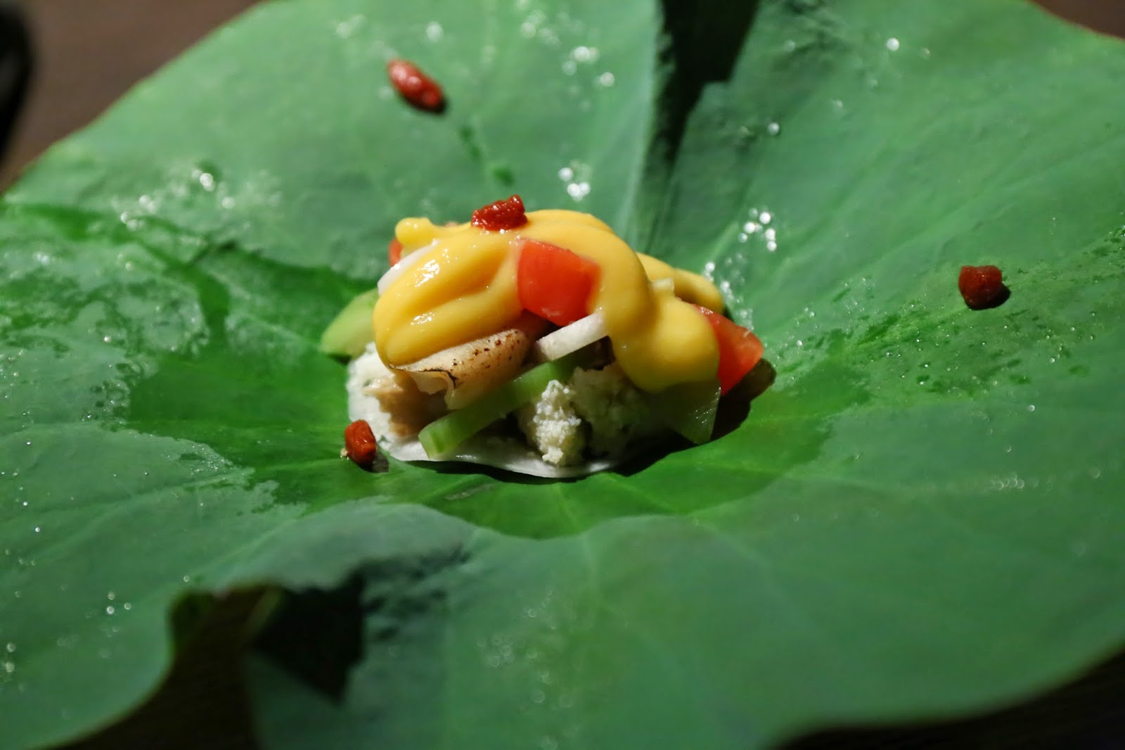 Starter: egg yolk vinegar, octopus eggs, geoduck, gluten, tomato, loofah, pear and wolfberries (前菜: 蛋黃醋 章魚卵 象拔蚌 楊麩 玉女蕃茄 絲瓜 梨 枸杞) - served on a lotus leaf. Not sure if I've ever had octopus eggs before, but this was pretty interesting. Lots of different ingredients lending multiple types of texture. I was particularly surprised by the presence of gluten here.