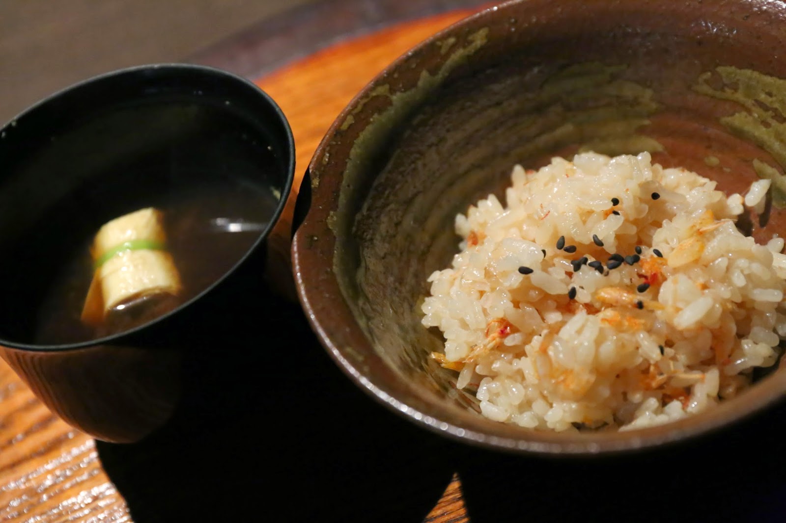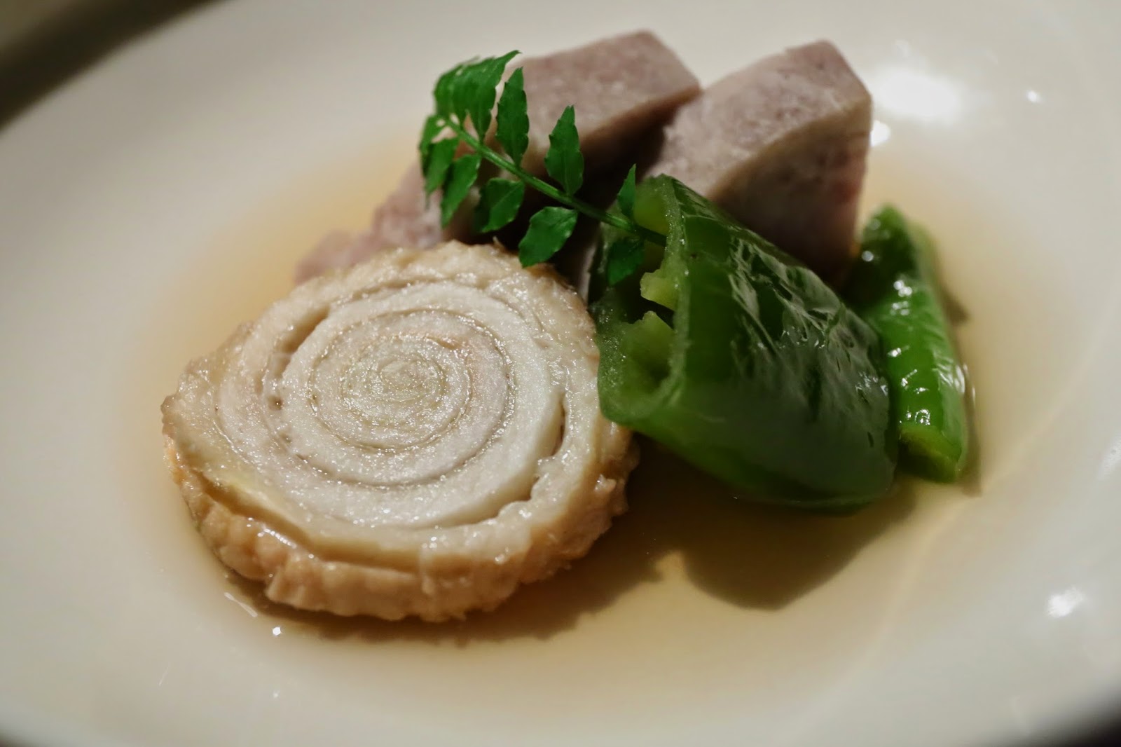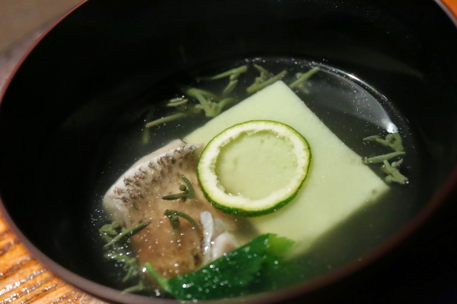 Starter soup: edamame tofu, rosy seasbass, water shield, yuzu rind (前湯:枝豆豆腐 紅喉 鶴菜 蓴菜 柚子輪) - the tofu had a pretty sticky texture like mochi (もち), and my inner child came out as I stretched and played with it a little. The edamame (枝豆) flavors were definitely there. I always love water shield (蓴菜) for the slippery texture that also makes it fun to play with. While I loved the fragrance that yuzu (柚子) imparts, I thought for some reason that the soup was slightly bitter...