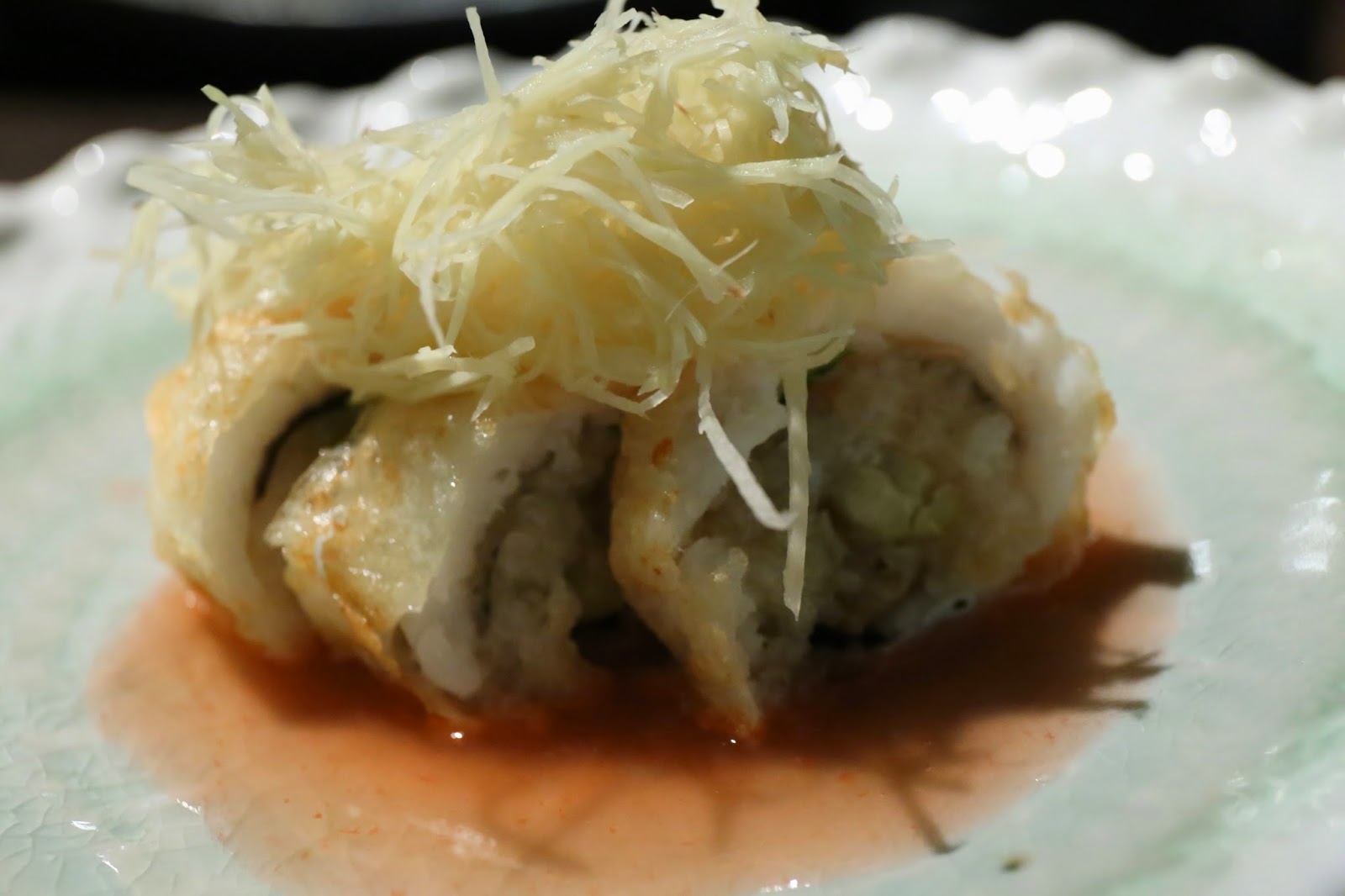 Deep-fried: pike conger, Domyoji rice, dried shiitake, fava beans, plum sauce (炸品:海鰻 道明寺米 乾香菇 蠶豆 梅肉芡汁) - summer is pike conger season, so I'm not at all surprised to see this on the menu. Interestingly this was made into a roll and stuffed with sticky rice, fava beans and dried shiitake mushrooms. And yes, plum sauce and pike conger is a classic combination. Topped with a ton of shredded ginger.