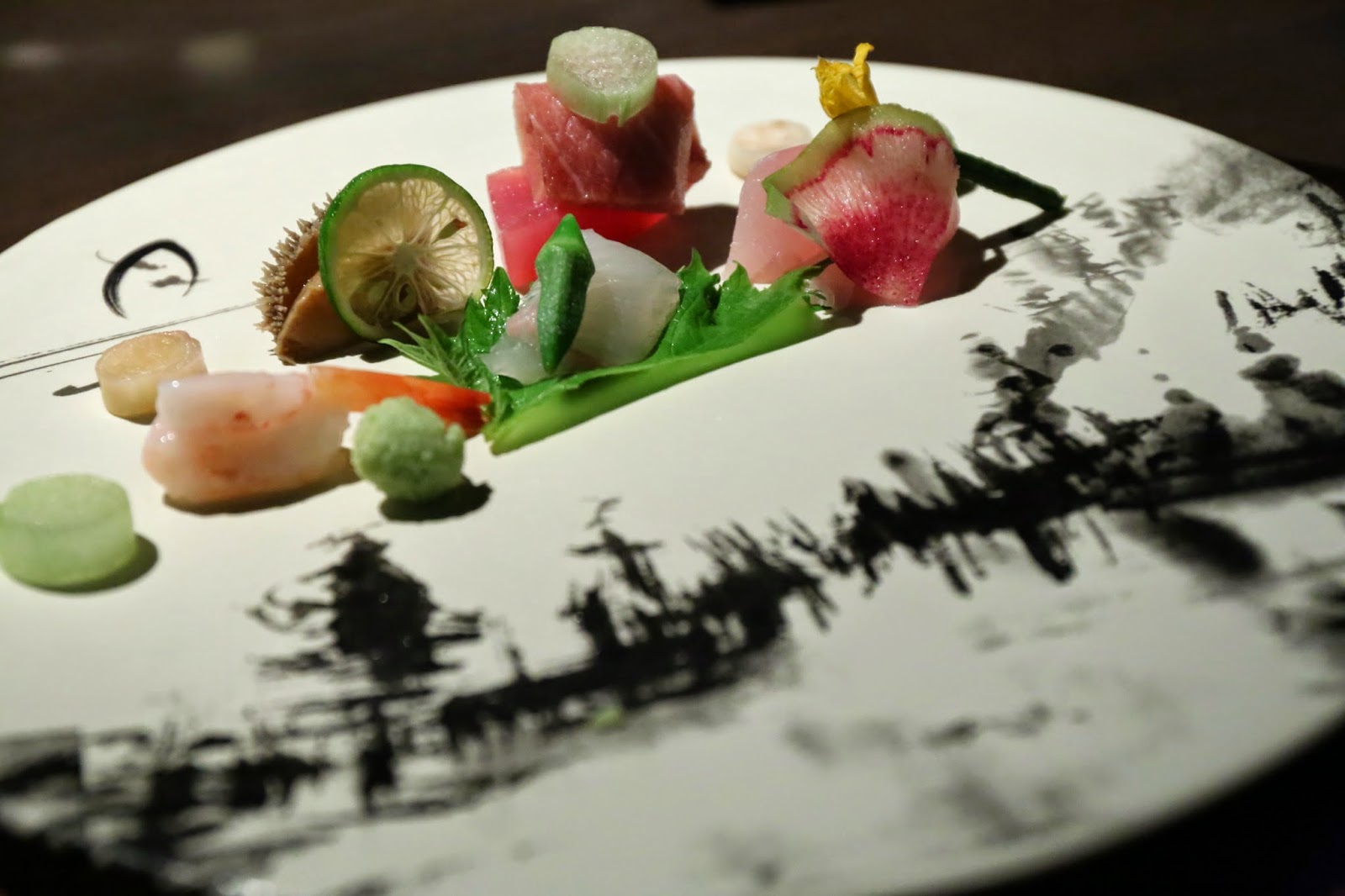 Raw: seasonal sashimi (生品:季節生魚片) - sweet shrimp (甘エビ), abalone (鮑), olive flounder (平目), fatty tuna (トロ) that I gave away; served with myoga (茗荷), cucumber flower, taro stem (芋茎) and okra. The plates, which resemble Chinese ink paintings, were very pretty. Surprisingly, the wasabi tasted a little too sharp today...