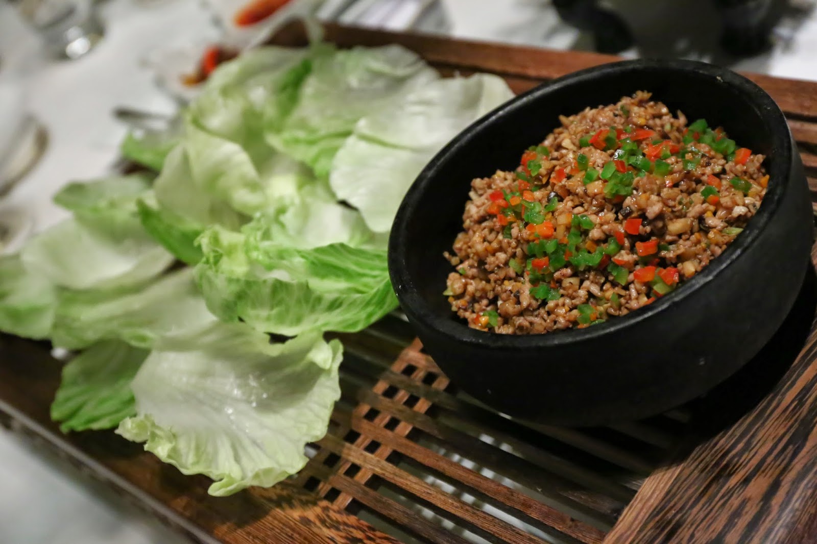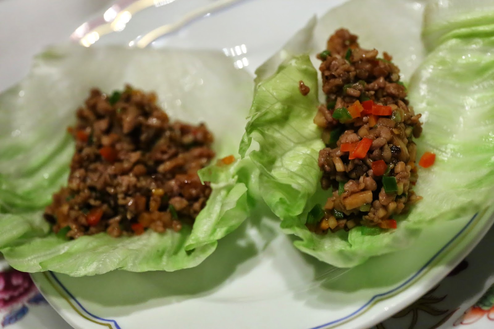 Stir-fried minced quail and assorted vegetables in lettuce cups (炒鵪鶉鬆) - this is normally served with pigeon, but it's nice to have quail, too.