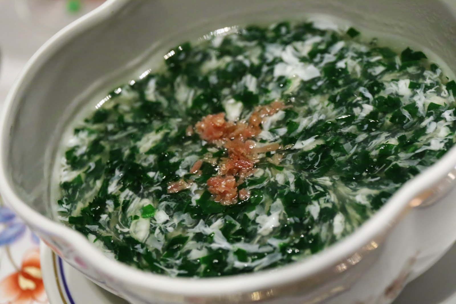 Minced spinach soup with supreme stock (碧綠菜蓉羹) - we seemed to have skipped a dish, but oh well. This was absolutely beautiful! The spinach was not puréed but cut into shreds by hand, once again showcasing the knife skills of the kitchen. It's almost as fine as the egg drops in the soup. The ham flavors of the supreme stock were beautiful, and enhanced by a sprinkle of shredded ham on top.