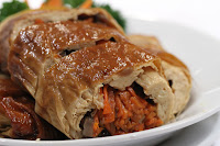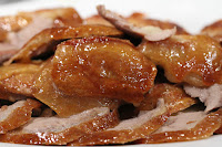 Roast Peking duck (北京填鴨) - finally, the main event. Pretty traditional, and the duck was actually fairly lean. It was sliced up away from us, so I didn't see if there was a river of oil coming off the duck… but I suspect not. The pancake was a little on the dry side, but never mind… Happy.